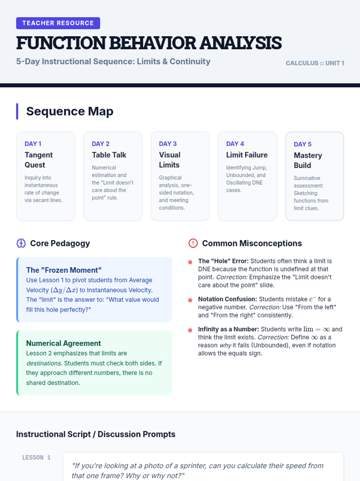 A comprehensive 12th-grade calculus unit that synthesizes limits, first derivatives, and second derivatives to analytically sketch and analyze complex functions without technology. Students progress from isolating specific derivative behaviors to integrating all analytical tools into a master sketching protocol.