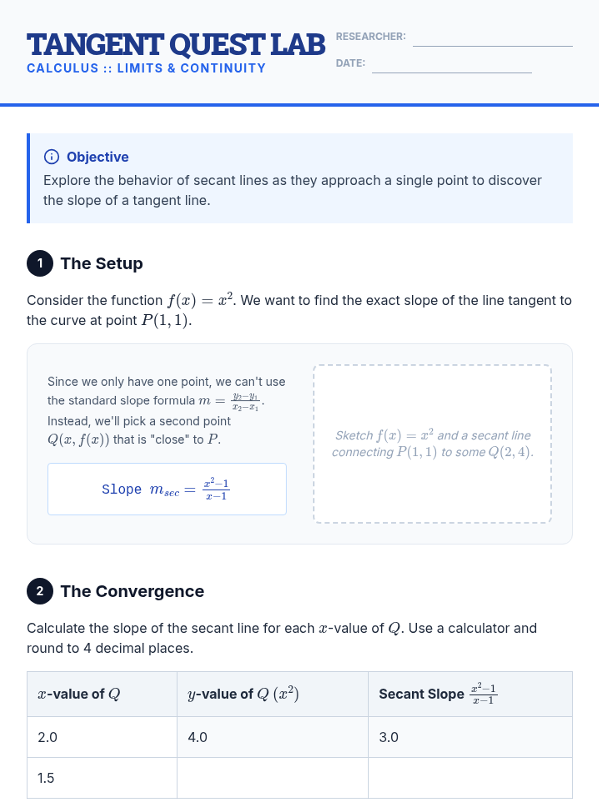 A 12th-grade Calculus sequence introducing limits through the tangent line problem, numerical estimation, and graphical analysis of function behavior. Students progress from intuitive approximations to understanding one-sided limits and cases where limits fail to exist.