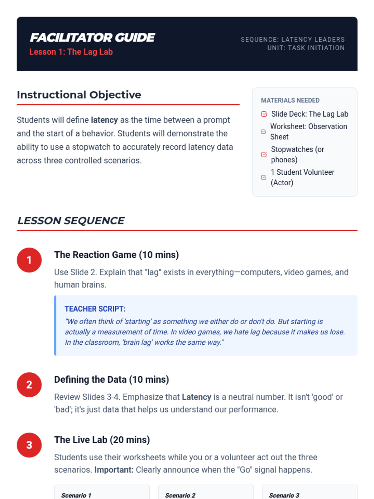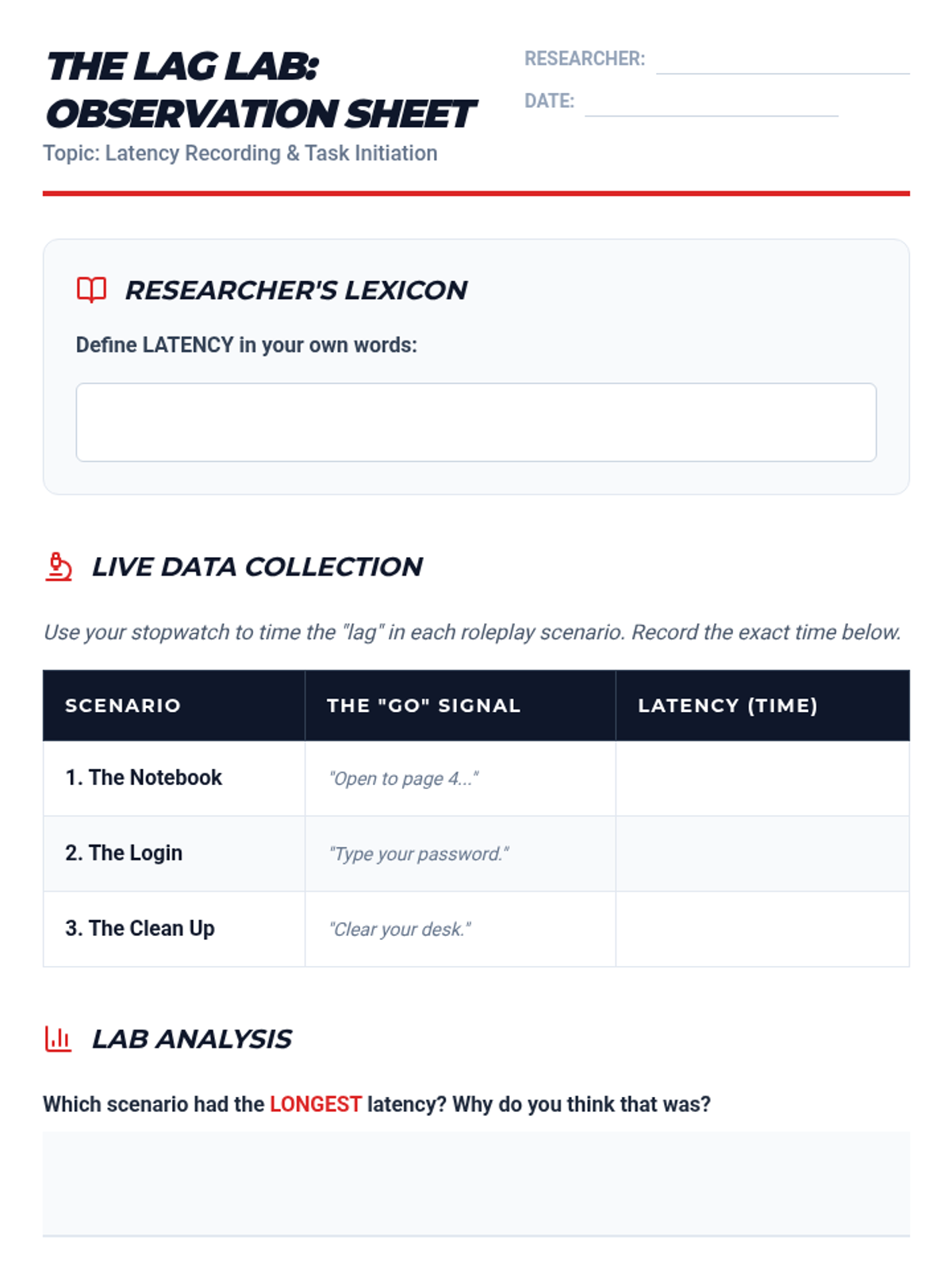A data-driven executive function sequence where students learn to measure, monitor, and reduce 'latency' (the time between a request and action) using timers and cognitive strategies. Students move from passive resistance to active self-regulation by turning task initiation into a personal performance challenge.