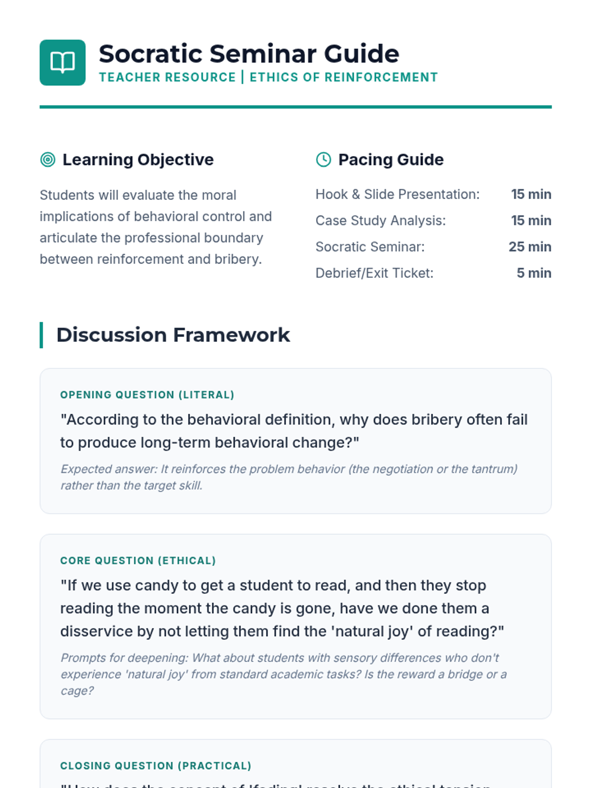 This advanced 12th-grade sequence explores the ethical transition from extrinsic reinforcement to intrinsic motivation and independence. Students learn professional behavioral strategies including prompt fading, conditioning secondary reinforcers, and designing self-management systems to ensure long-term behavioral generalization and maintenance.