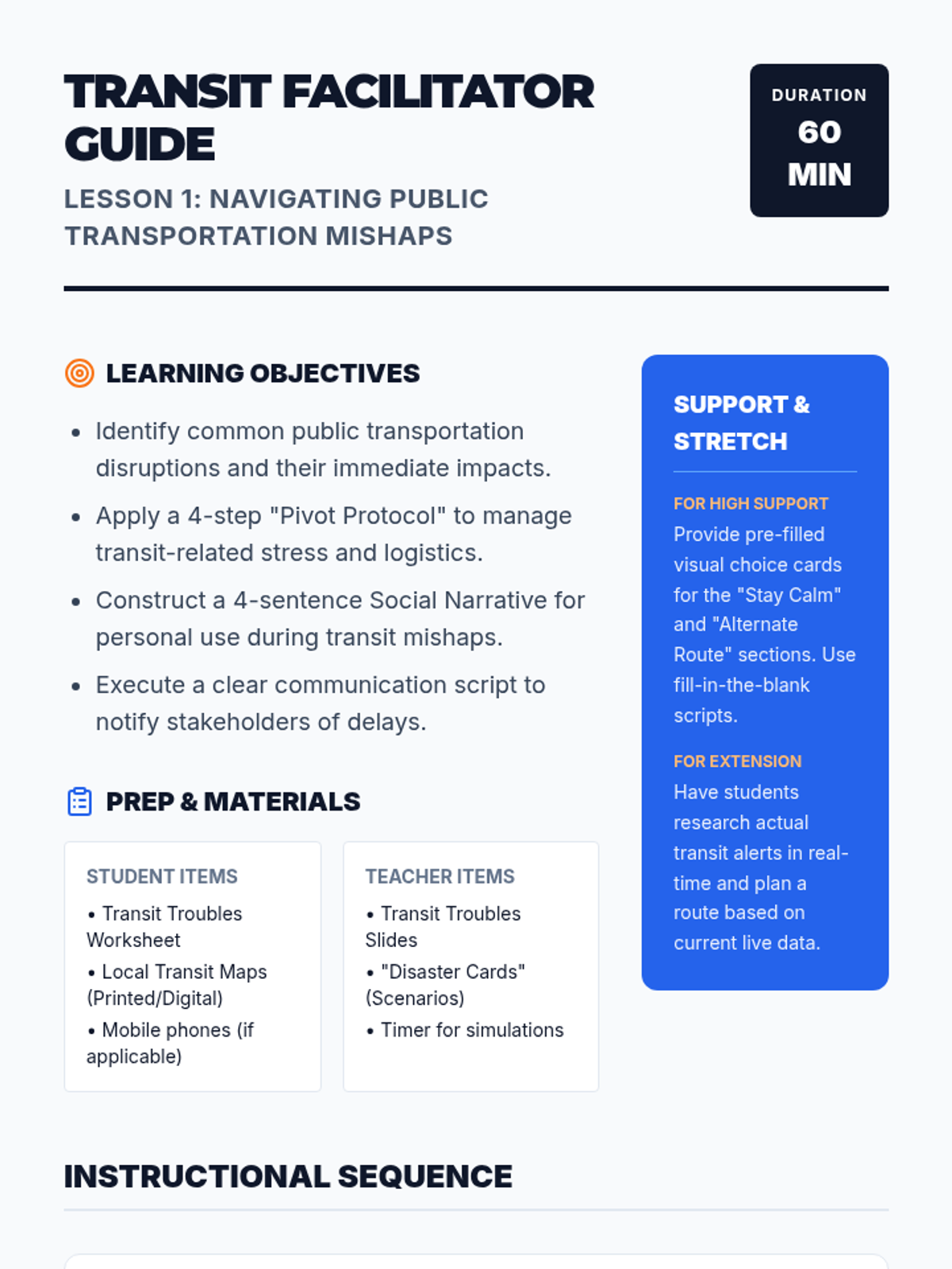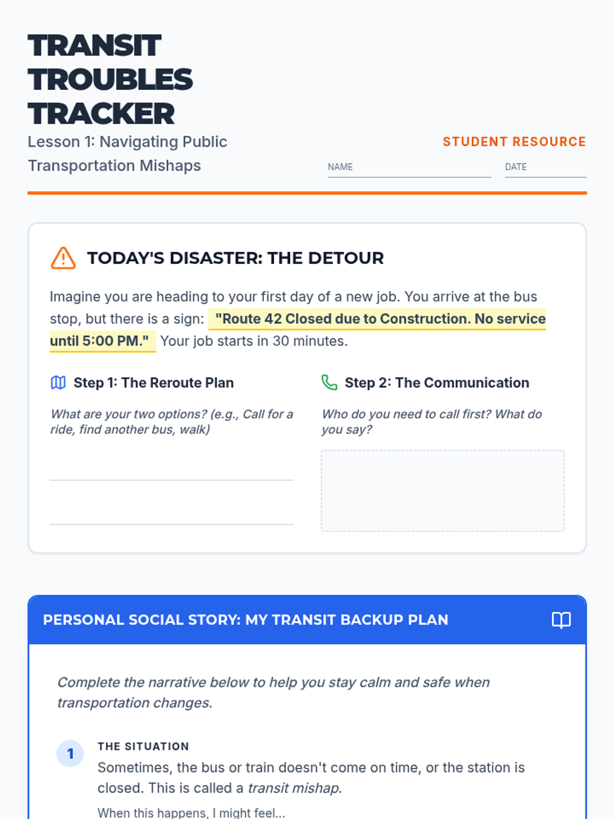 A 12th-grade Special Education sequence focused on transition-to-adulthood social stories. Students learn to create personal narratives for navigating transportation failures, authority interactions, consumer rights, roommate conflicts, and general community unpredictability to foster independence and safety.