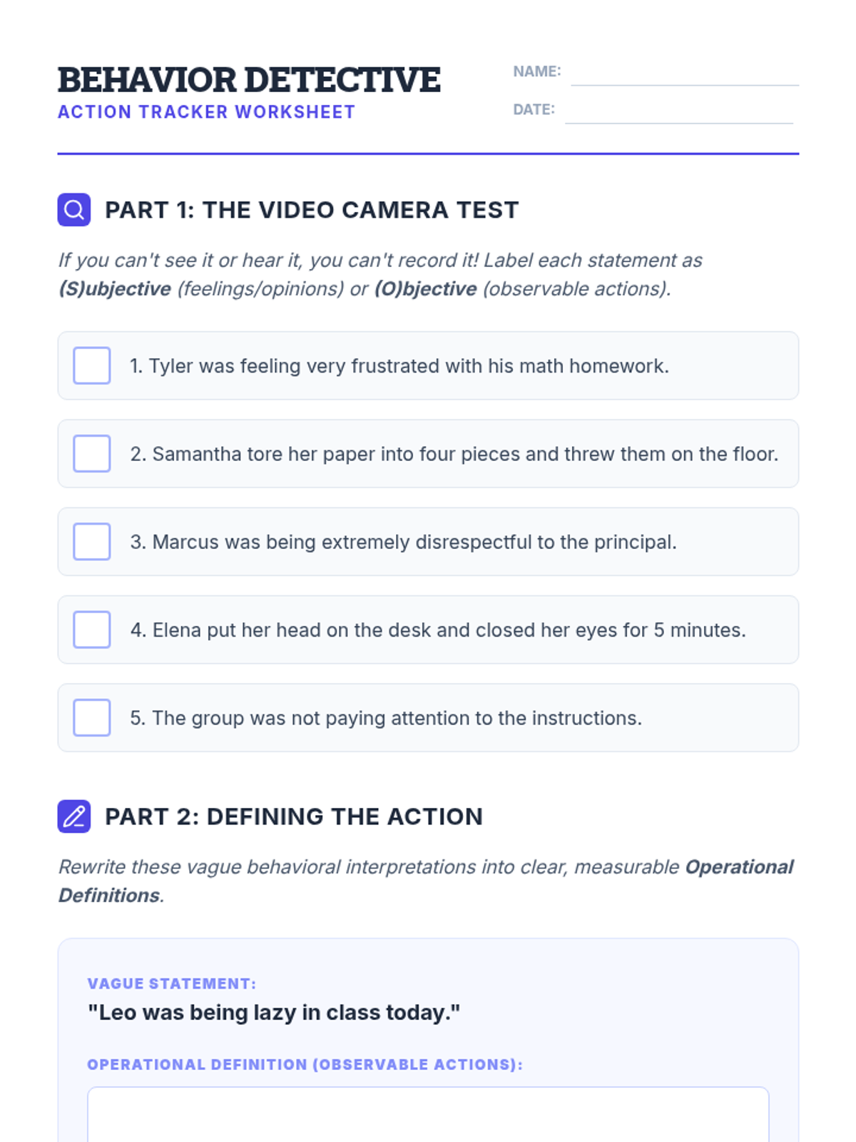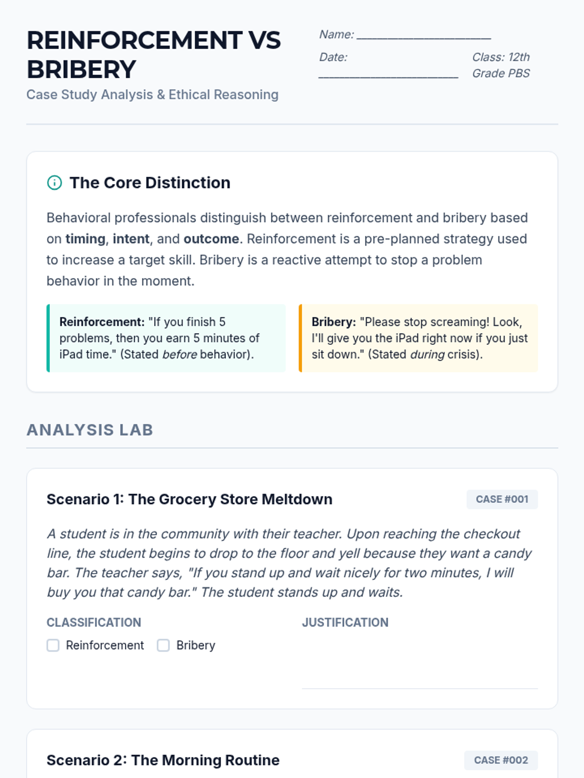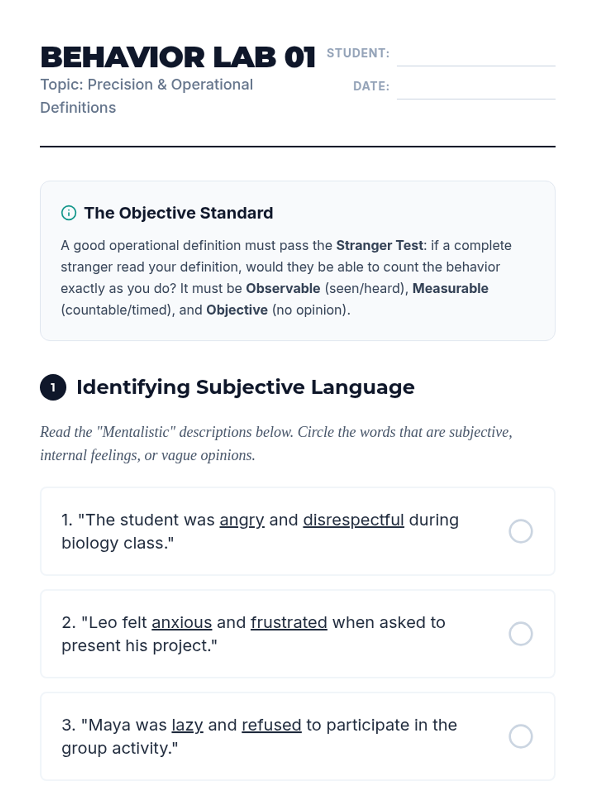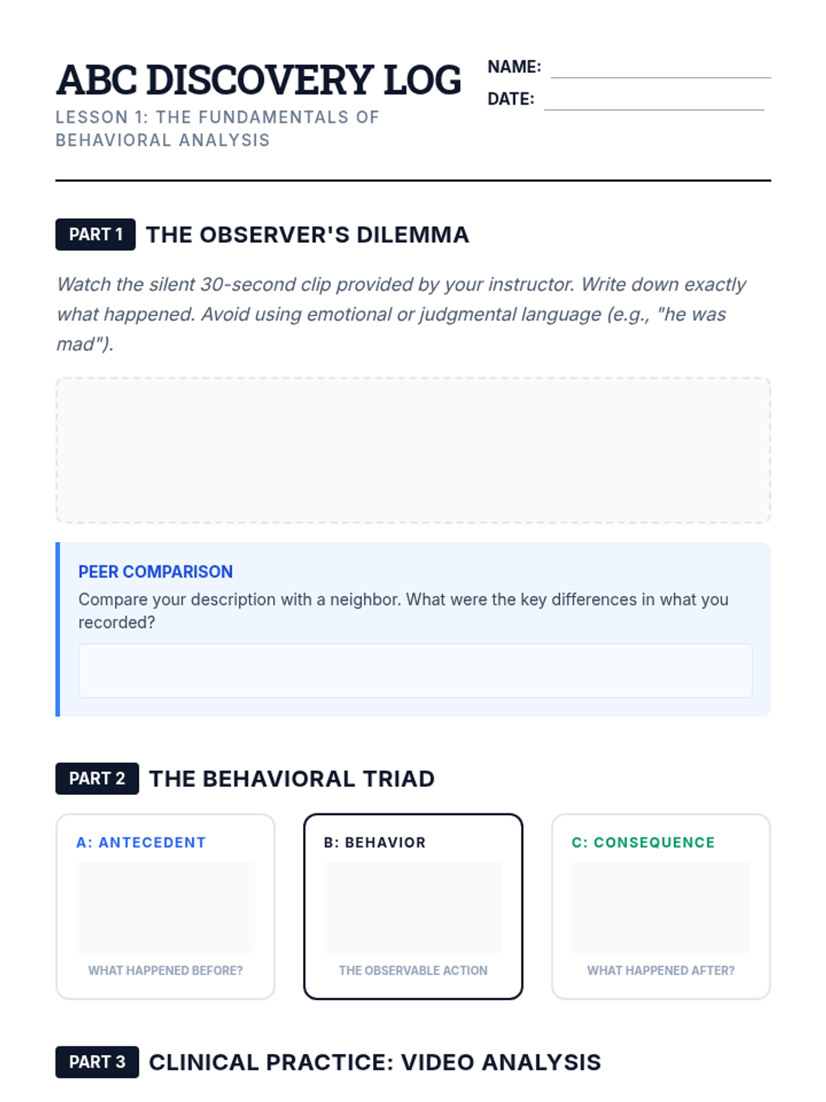 A comprehensive introduction to the Antecedent-Behavior-Consequence (ABC) model. Students learn to define observable behaviors, identify environmental triggers, and analyze the functions of consequences through case studies and workshops.