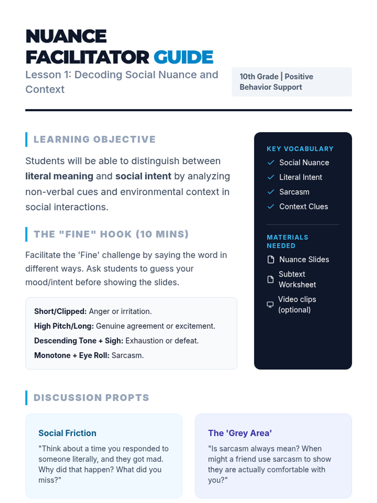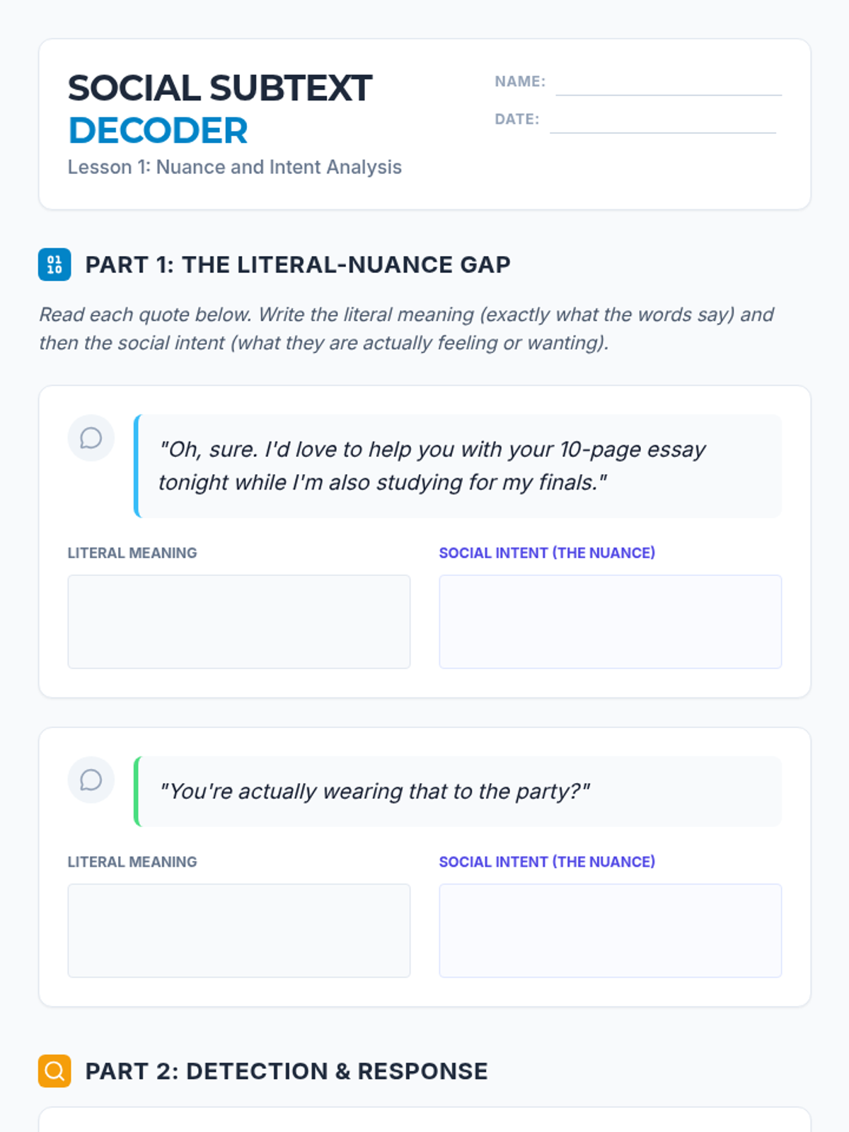 A specialized social skills sequence for high school students focusing on executive function, emotional regulation, and social boundaries. This sequence uses a modern, tech-inspired 'Social Navigator' theme to engage 9th-grade students in self-monitoring and problem-solving.