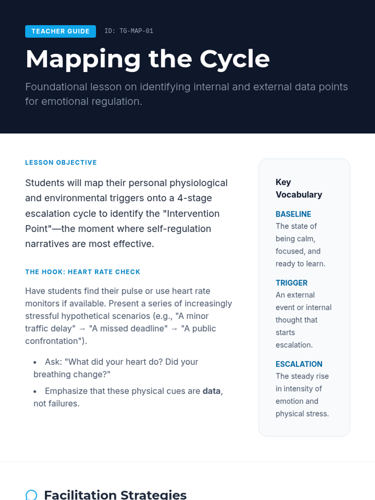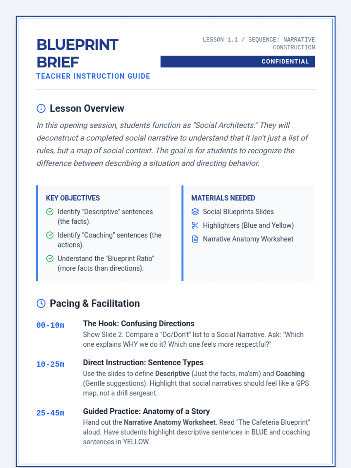 A comprehensive sequence for 12th-grade students to master emotional self-regulation through the creation of personalized social stories and 'if/then' narratives. Students progress from identifying physiological triggers to designing and simulating visual regulation protocols.