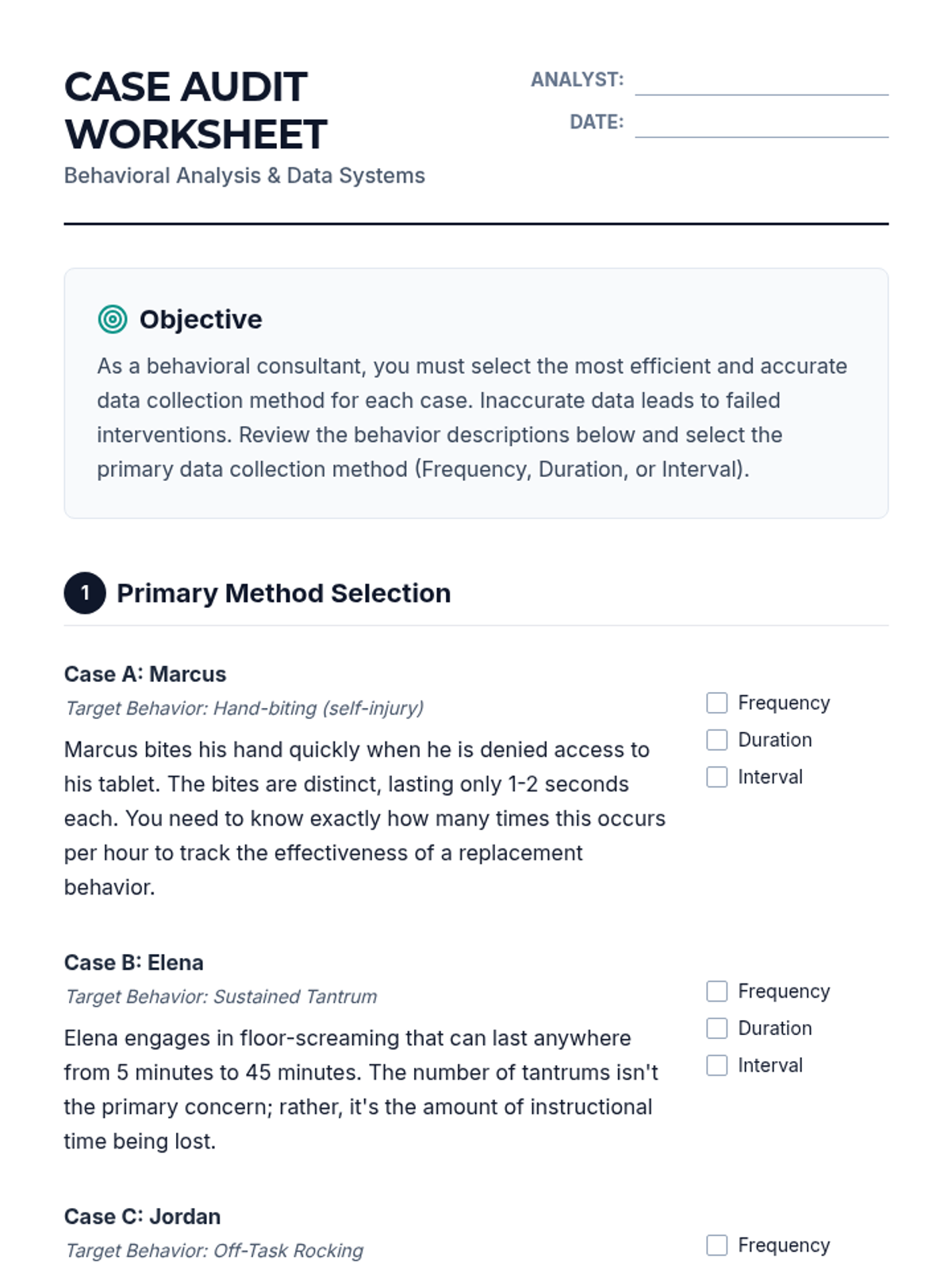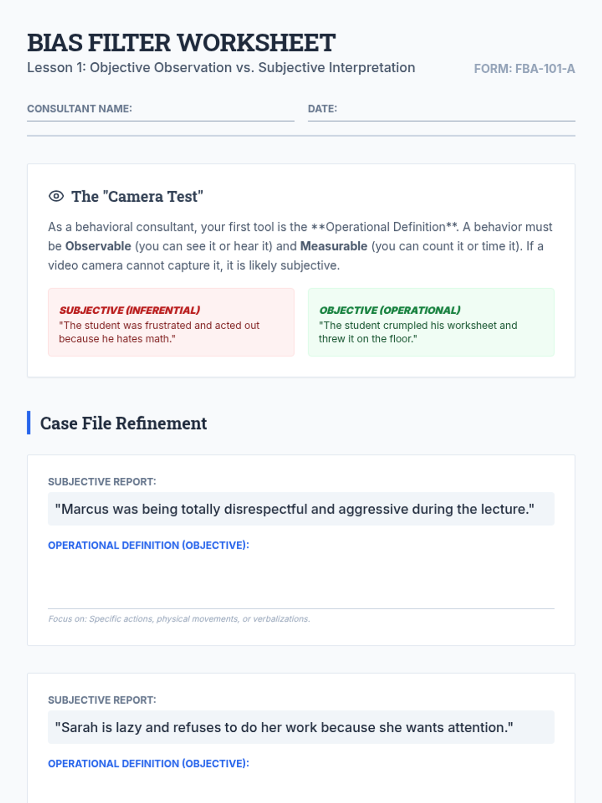 A technical, simulation-based sequence training 12th-grade students in the skills of conducting Functional Behavior Assessments (FBAs) through objective data collection, ABC recording, and pattern analysis.