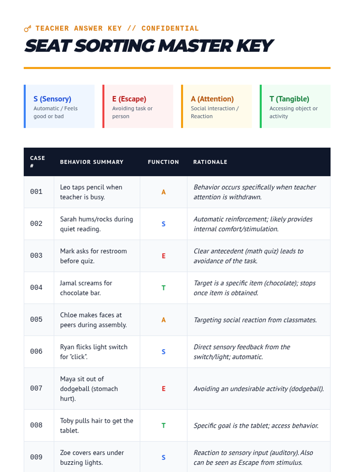 A comprehensive 12th-grade unit exploring the SEAT model (Sensory, Escape, Attention, Tangible) to understand why individuals engage in challenging behaviors and how to identify their underlying needs.