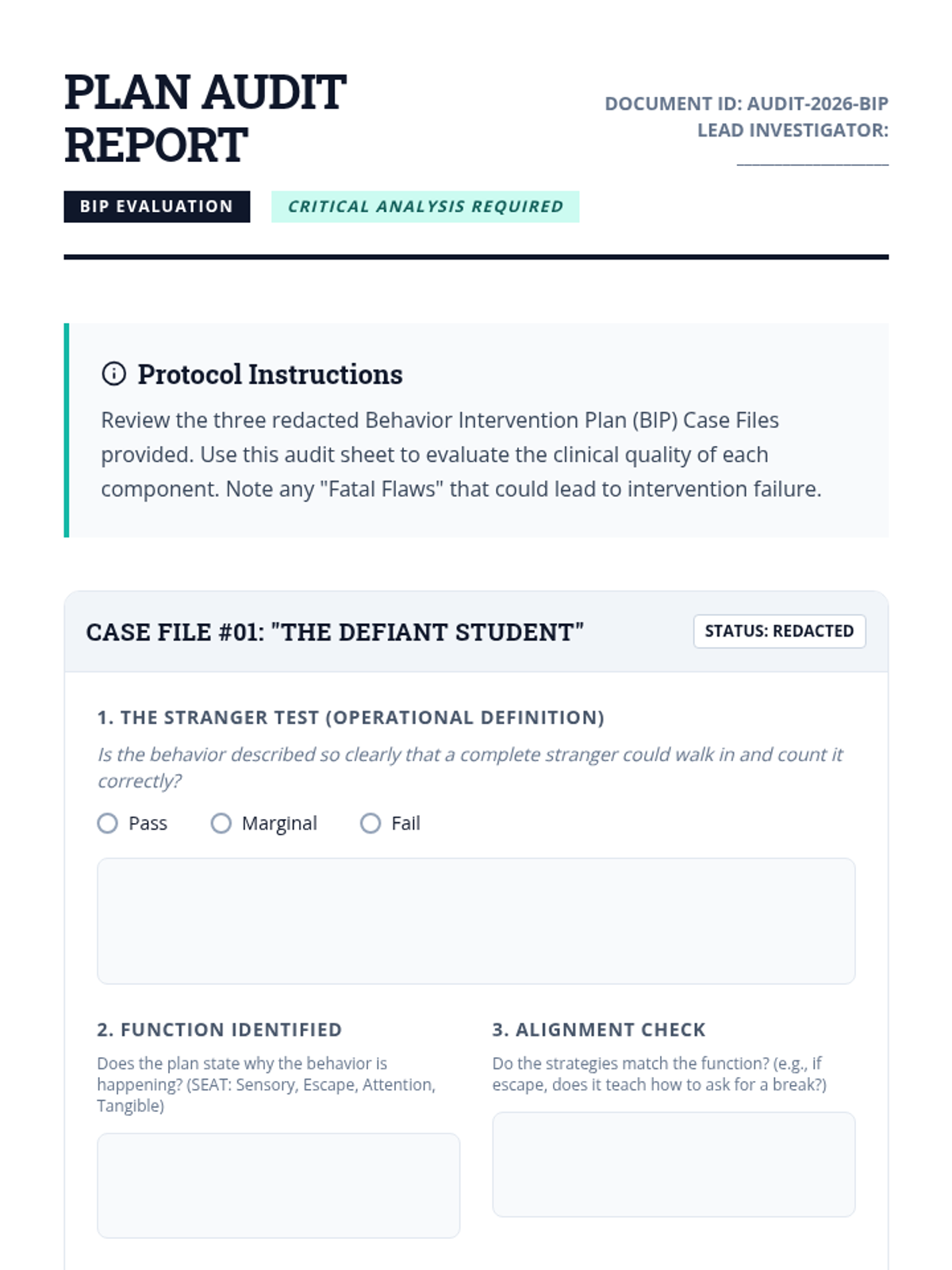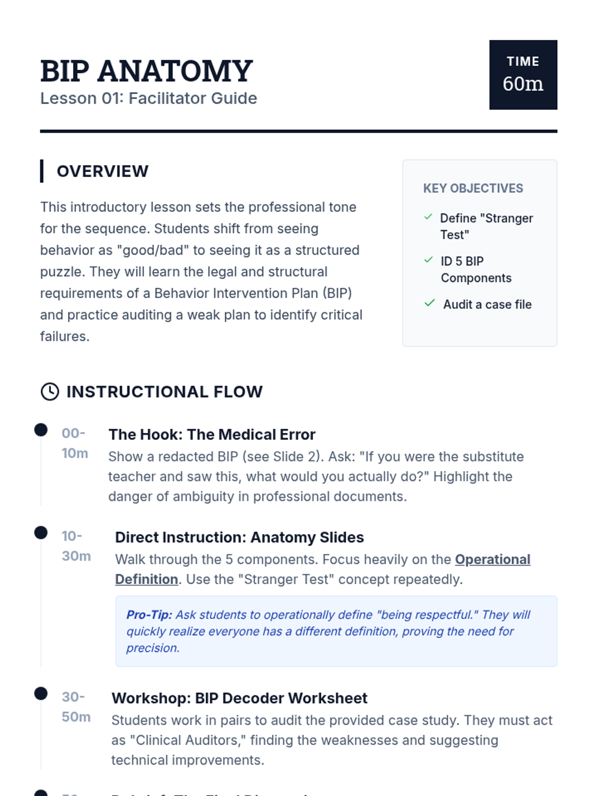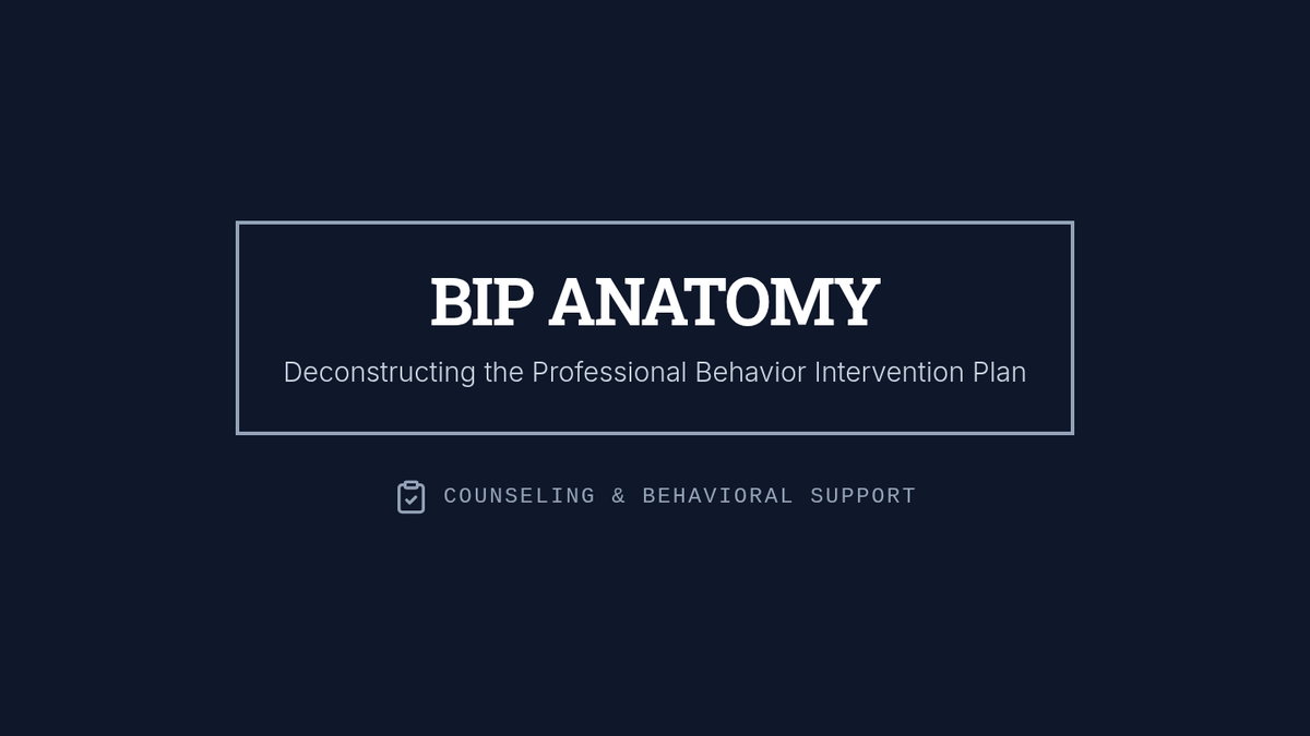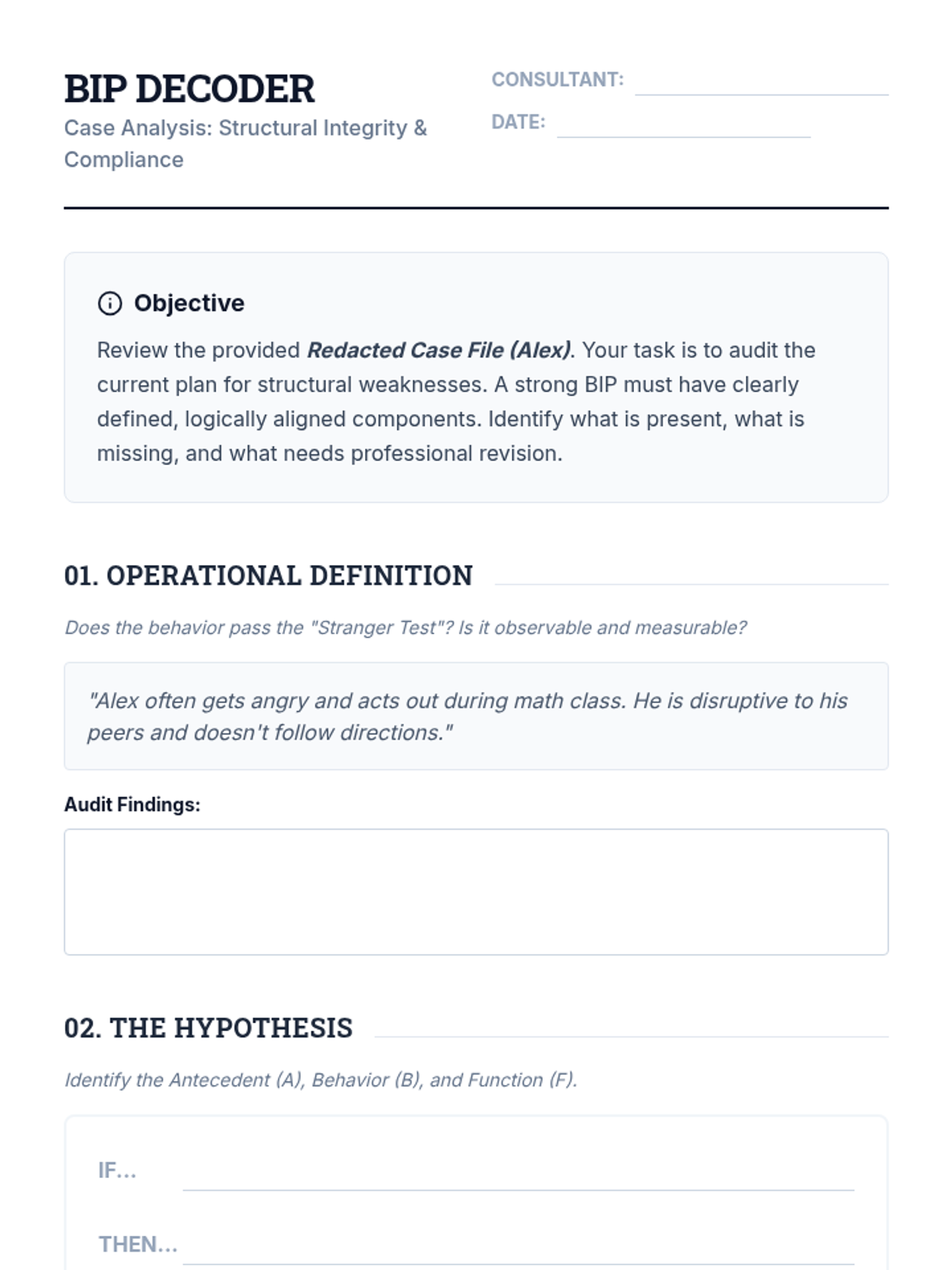 An advanced 12th-grade sequence on developing Comprehensive Behavior Intervention Plans (BIPs). Students transition from theoretical knowledge to professional application, following a complex case study through hypothesis, prevention, skill teaching, consequence strategies, and data-based decision making.