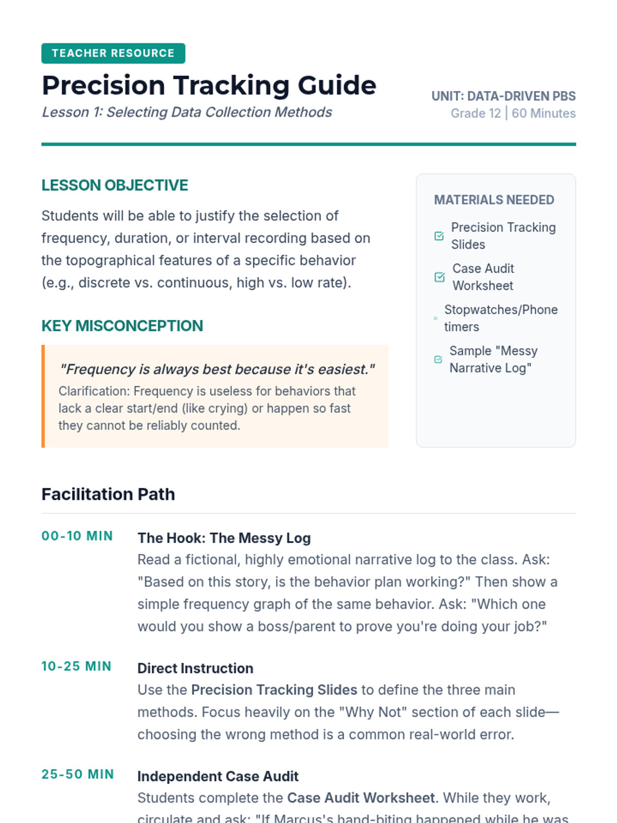 A technical and skill-based sequence for 12th graders focusing on the objective collection and analysis of behavioral data. Students master operational definitions, ABC recording, and quantitative measurement to identify environmental patterns and conduct mock functional assessments.
