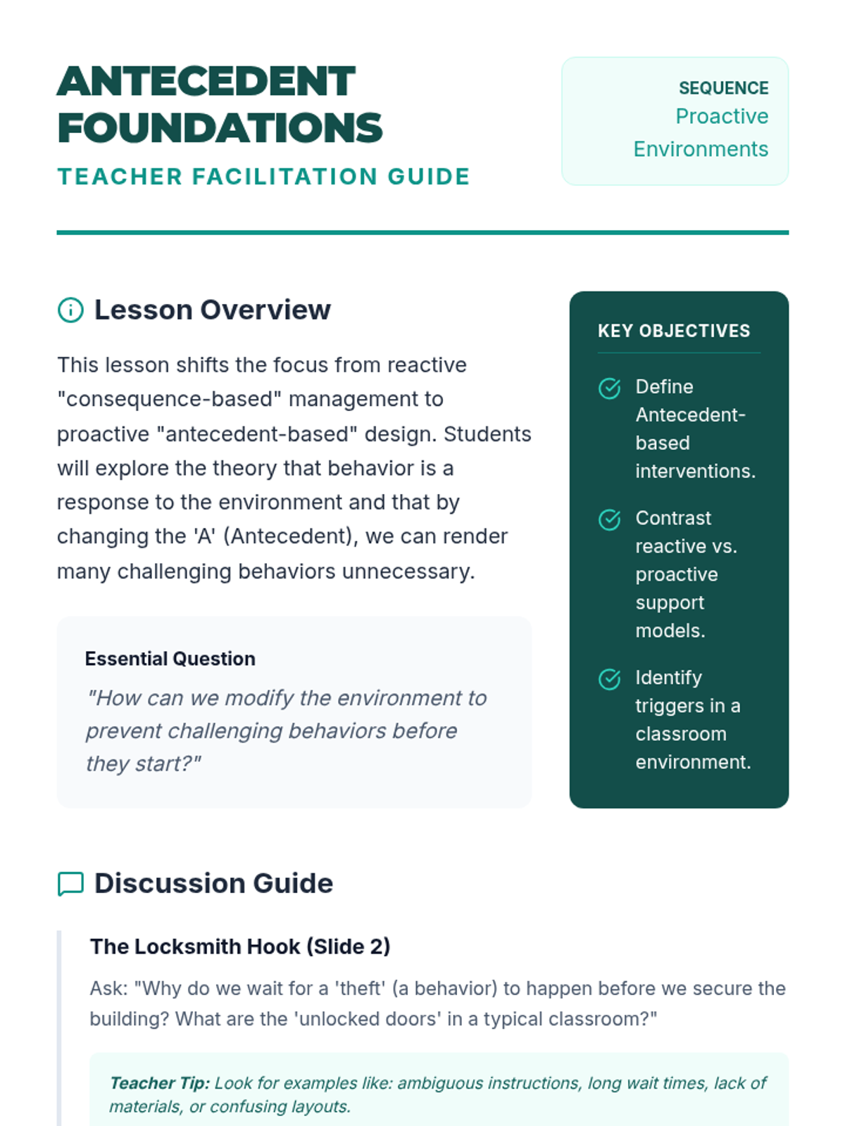 A comprehensive sequence for 12th-grade students exploring proactive environmental strategies in behavioral support. The sequence covers antecedent interventions, visual supports, task modifications, non-contingent reinforcement, and culminates in a final design project for a proactive classroom environment.