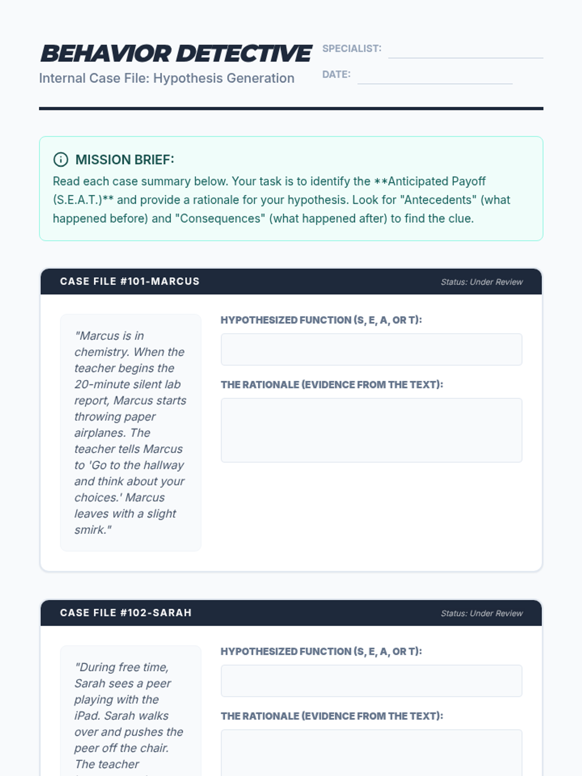 A project-based sequence for 12th-grade students simulating the professional workflow of a behavioral specialist. Students master the four functions of behavior, conduct a full Functional Behavior Assessment (FBA), and design a comprehensive Behavior Intervention Plan (BIP).