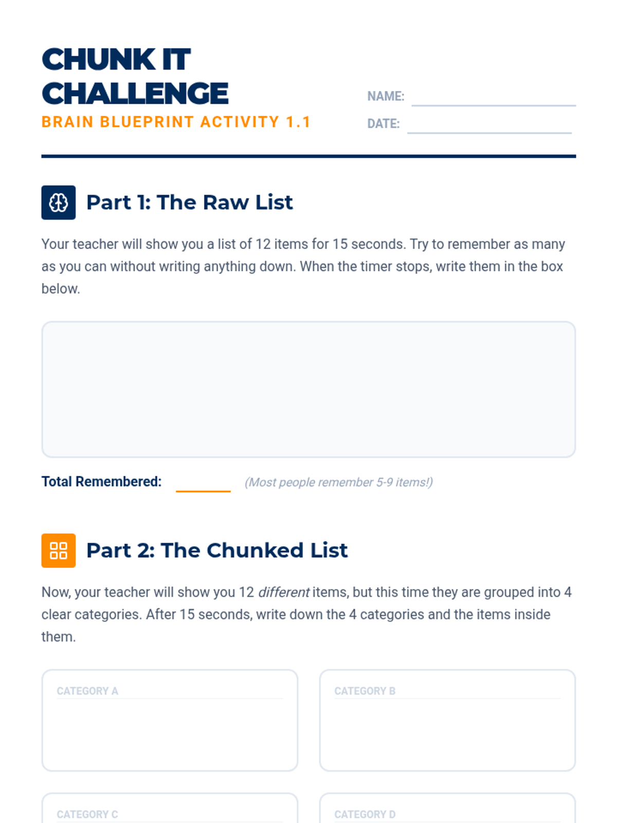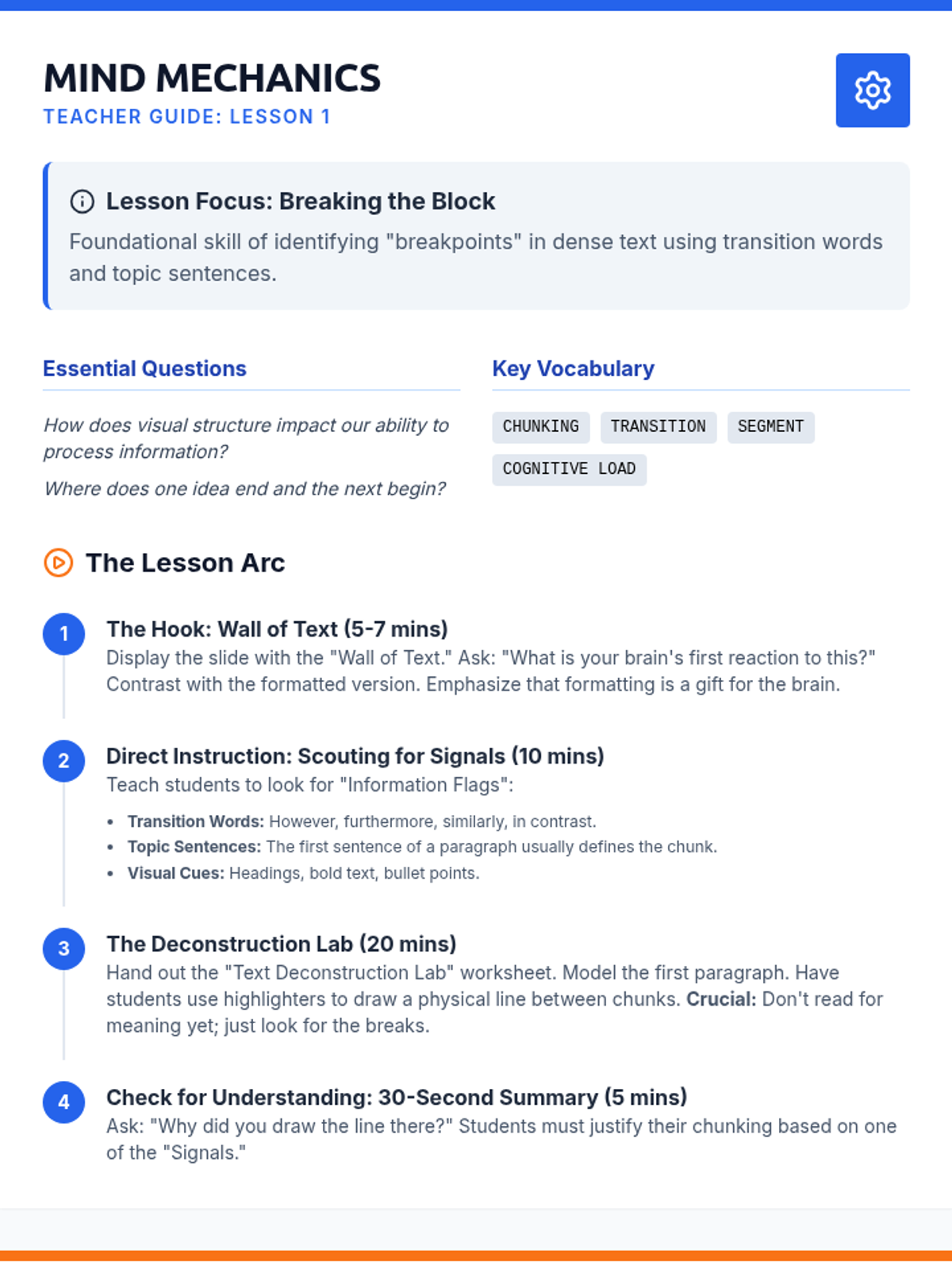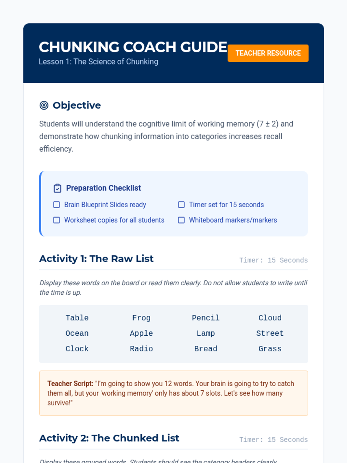 A specialized sequence for 7th-grade students to master 'chunking' techniques, reducing cognitive load and supporting working memory through strategic note-taking and organization. Students progress from understanding cognitive limits to creating sophisticated one-page synthesis tools.