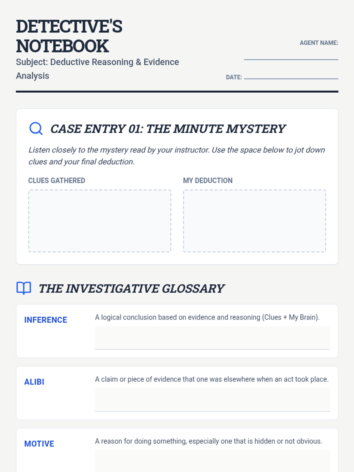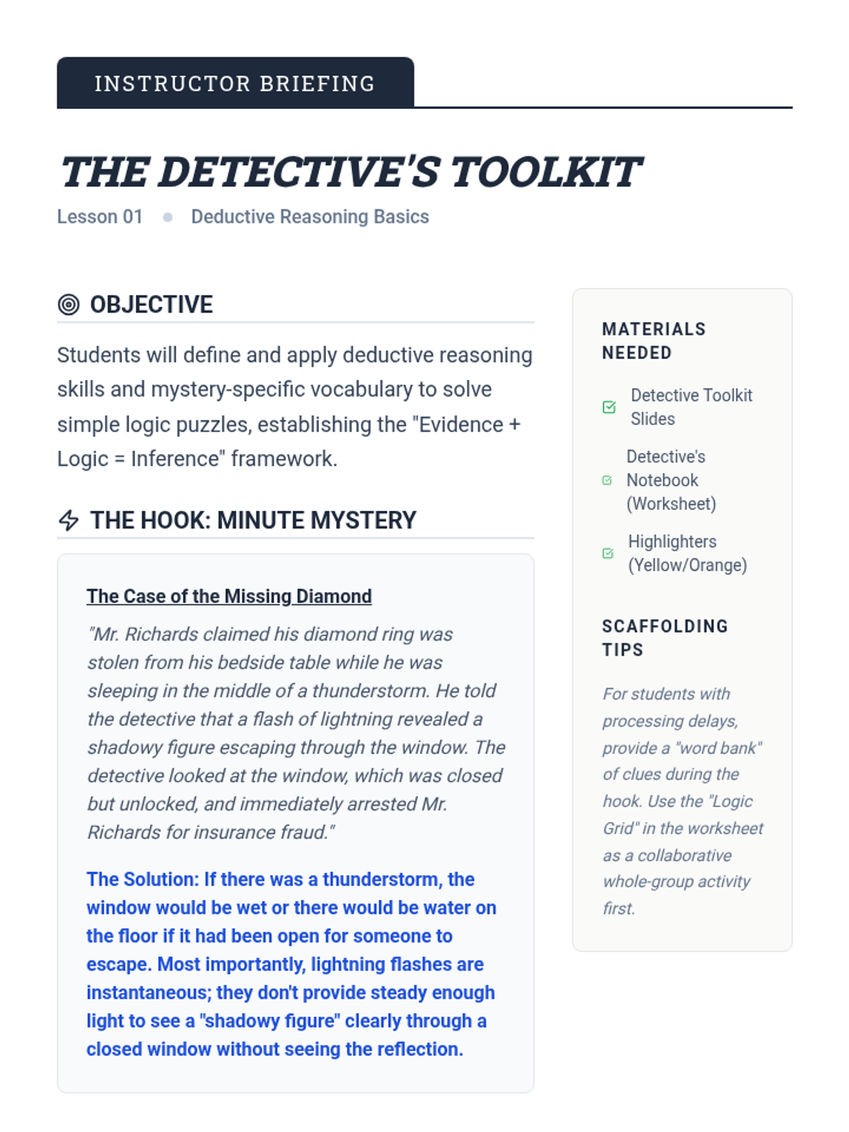 A 12th-grade Special Education sequence focused on reading comprehension through the lens of forensic investigation. Students learn to make inferences, detect unreliable narrators, and synthesize evidence using mystery-themed activities and case files.