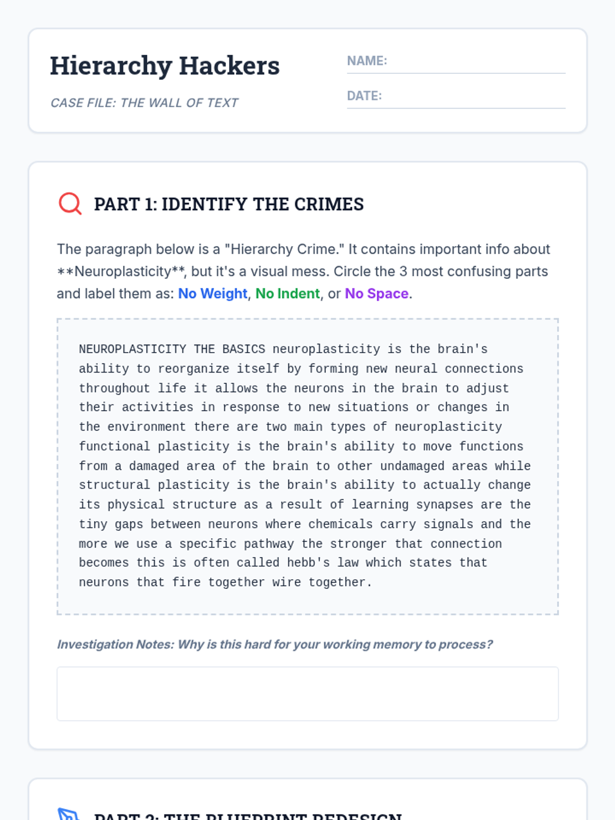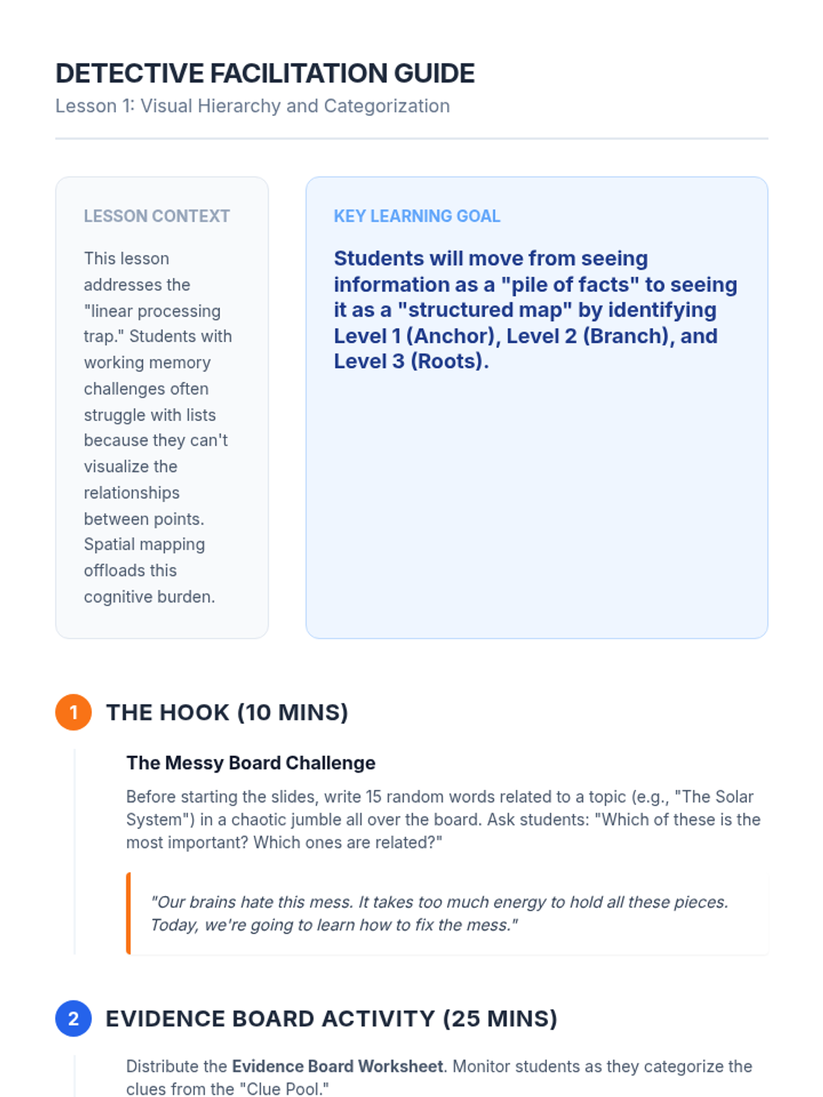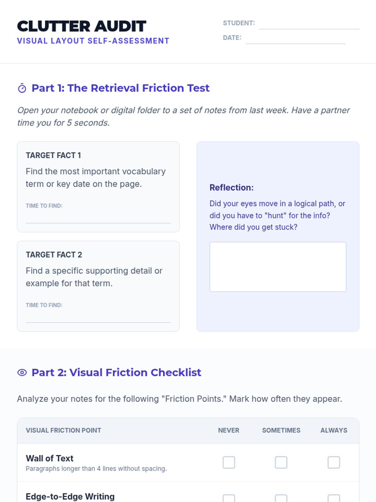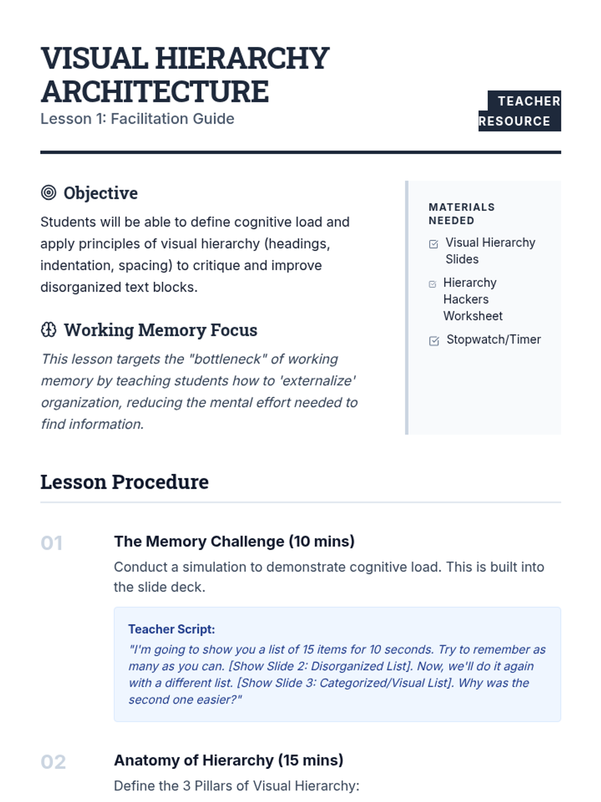 A 5-lesson sequence for 12th-grade students focusing on visual strategies to reduce cognitive load and support working memory through effective note-taking and organization. Students learn to audit clutter, use spatial organization, implement strategic color-coding, develop icon systems, and reformat complex information for accessibility.
