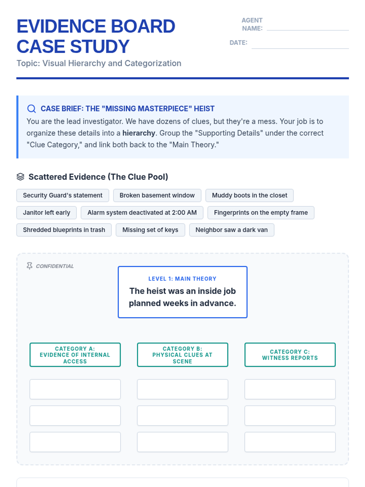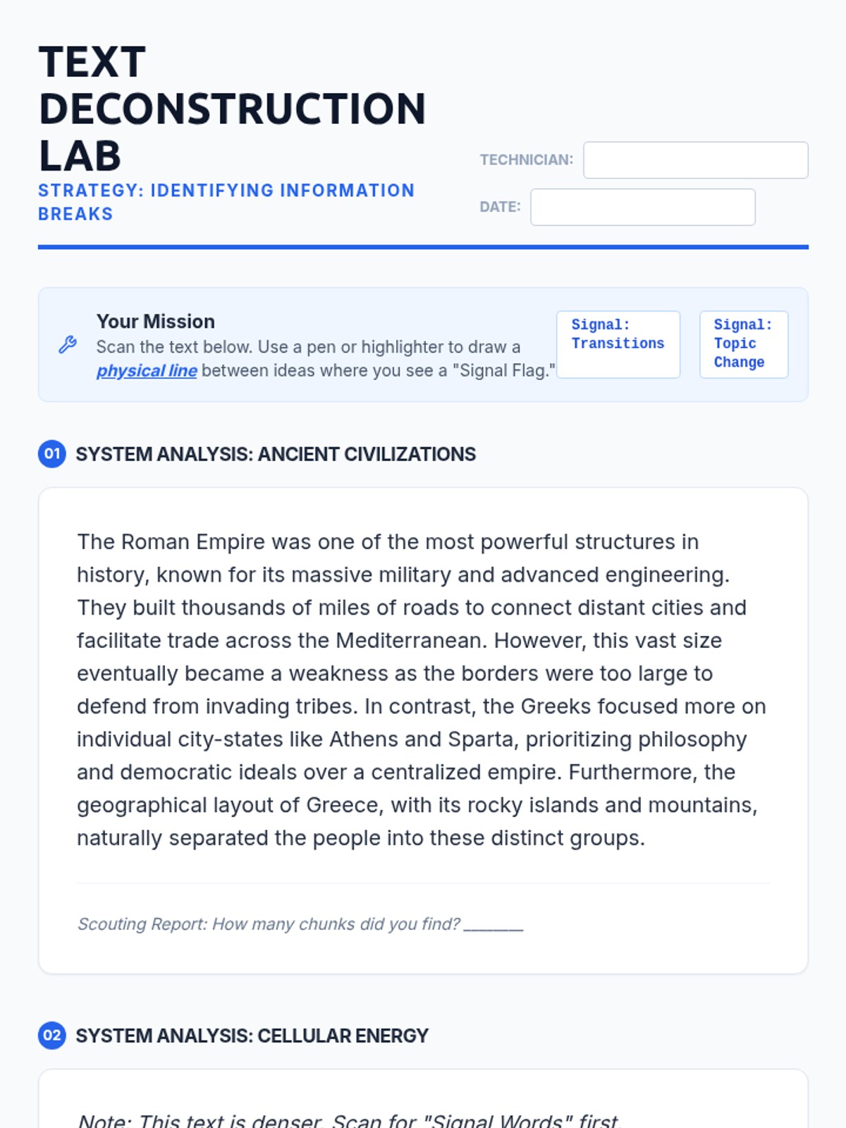 A comprehensive sequence designed to help 9th-grade students with working memory challenges master information chunking. Students move from identifying structural breaks in text to creating visual maps and summarizing auditory information, ultimately applying these strategies to their own academic coursework.