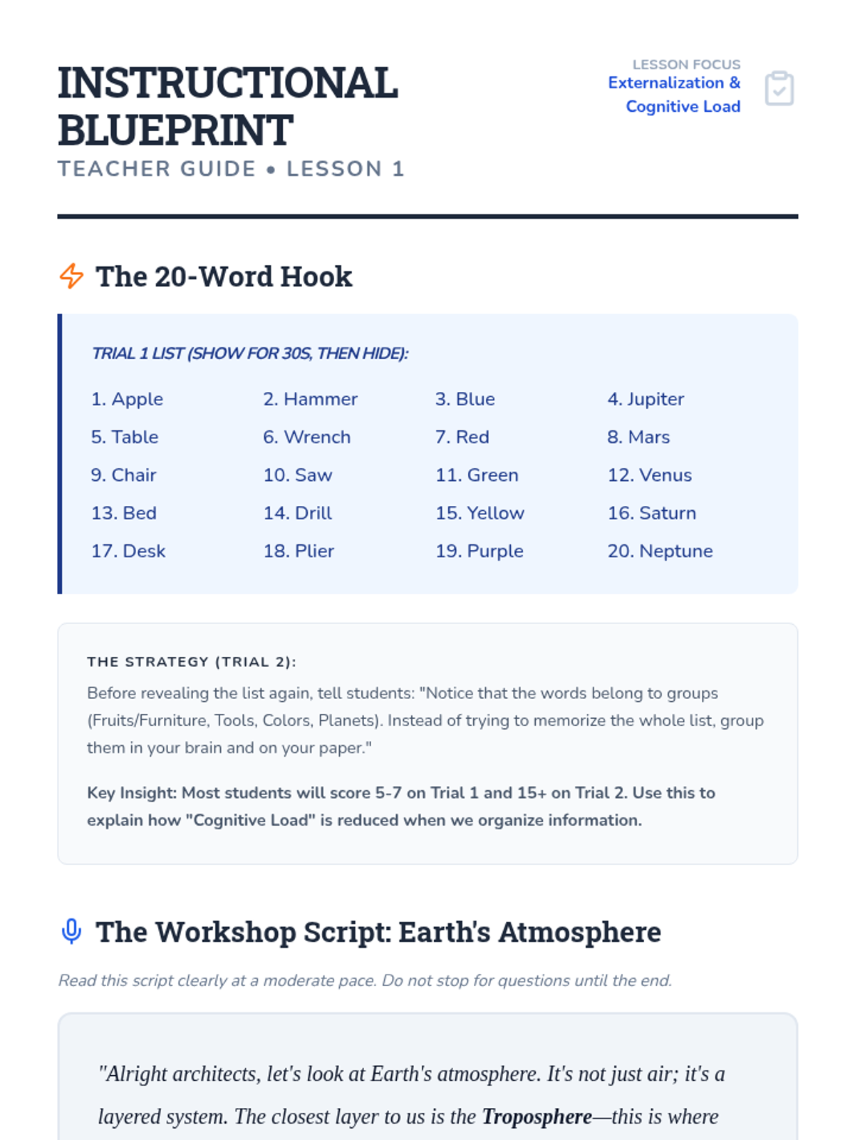 A 5-lesson sequence for 11th-grade students focused on working memory support through cognitive offloading. Students learn to externalize complex STEM processes using flowcharts, reference anchors, and error analysis to reduce mental load and improve accuracy.