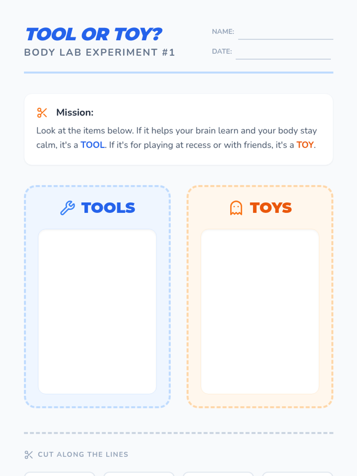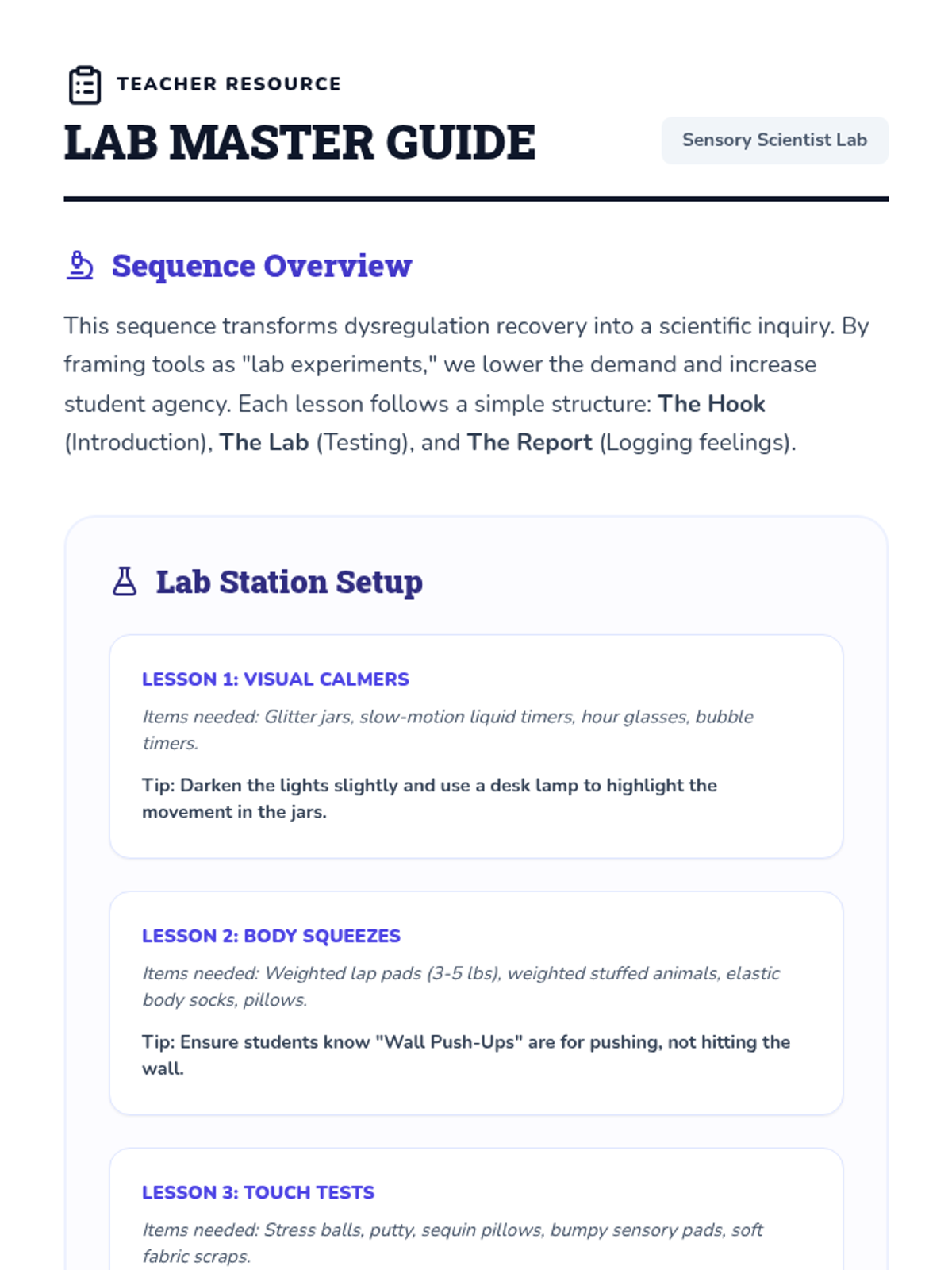 This inquiry-based sequence for 1st-grade students explores sensory tools as functional aids for dysregulation recovery. Students test proprioceptive, tactile, visual, and auditory inputs to build a personalized 'sensory menu' for returning to a calm state.