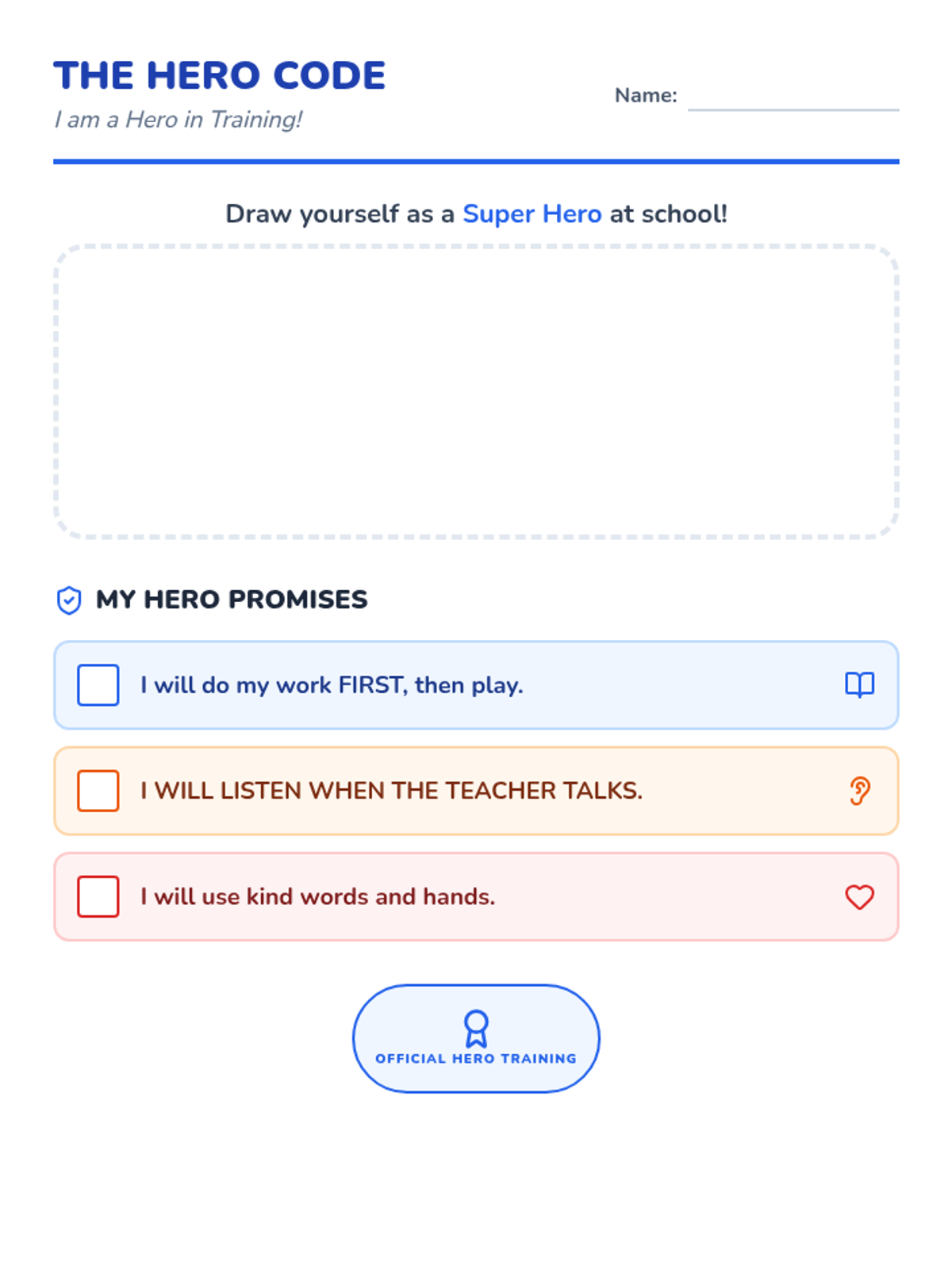 A series of resources and strategies designed to help 1st-grade students master classroom behavior, including noise control, hand gestures, and turn-taking at home and school.