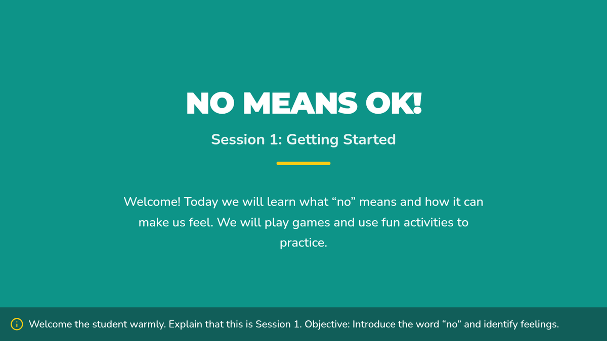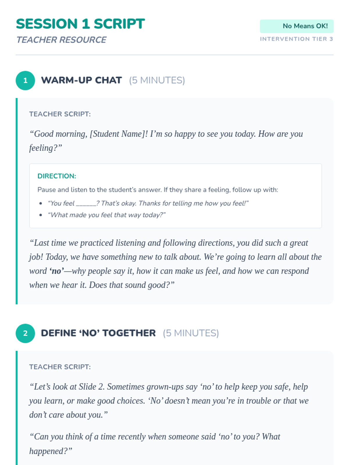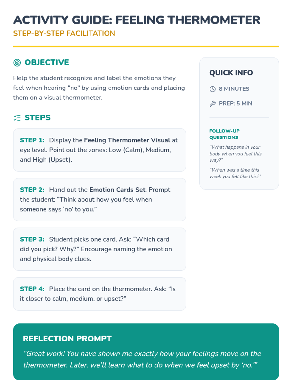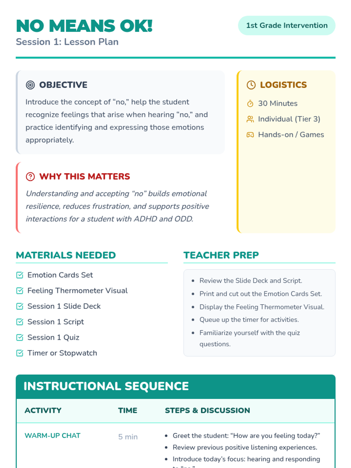A 10-session Tier 3 intervention designed for first-grade students with ADHD and ODD to build emotional resilience and positive communication strategies when hearing the word 'no'. The sequence progresses from basic emotion identification to complex social-emotional problem-solving and self-regulation techniques.