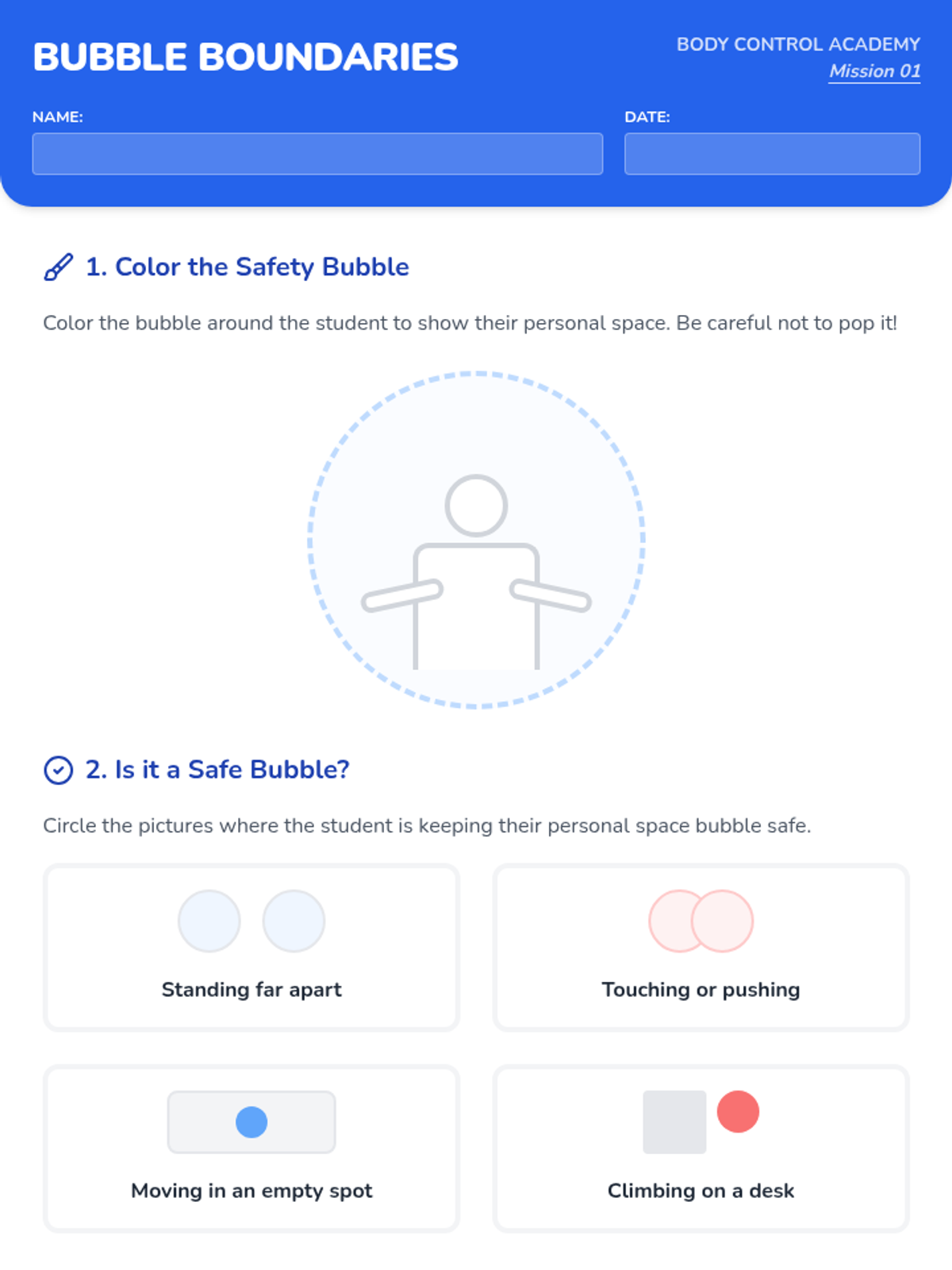 A comprehensive unit for 1st graders focusing on personal space awareness, physical boundaries, and positive behavior management using a fun space exploration theme.