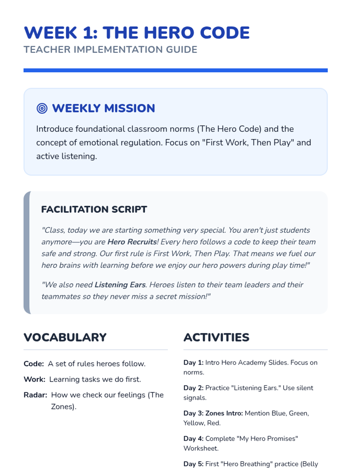 A 6-week social-emotional learning sequence for 1st graders with IEPs, focusing on classroom expectations, Zones of Regulation, and self-regulation strategies using a 'Hero Academy' theme.
