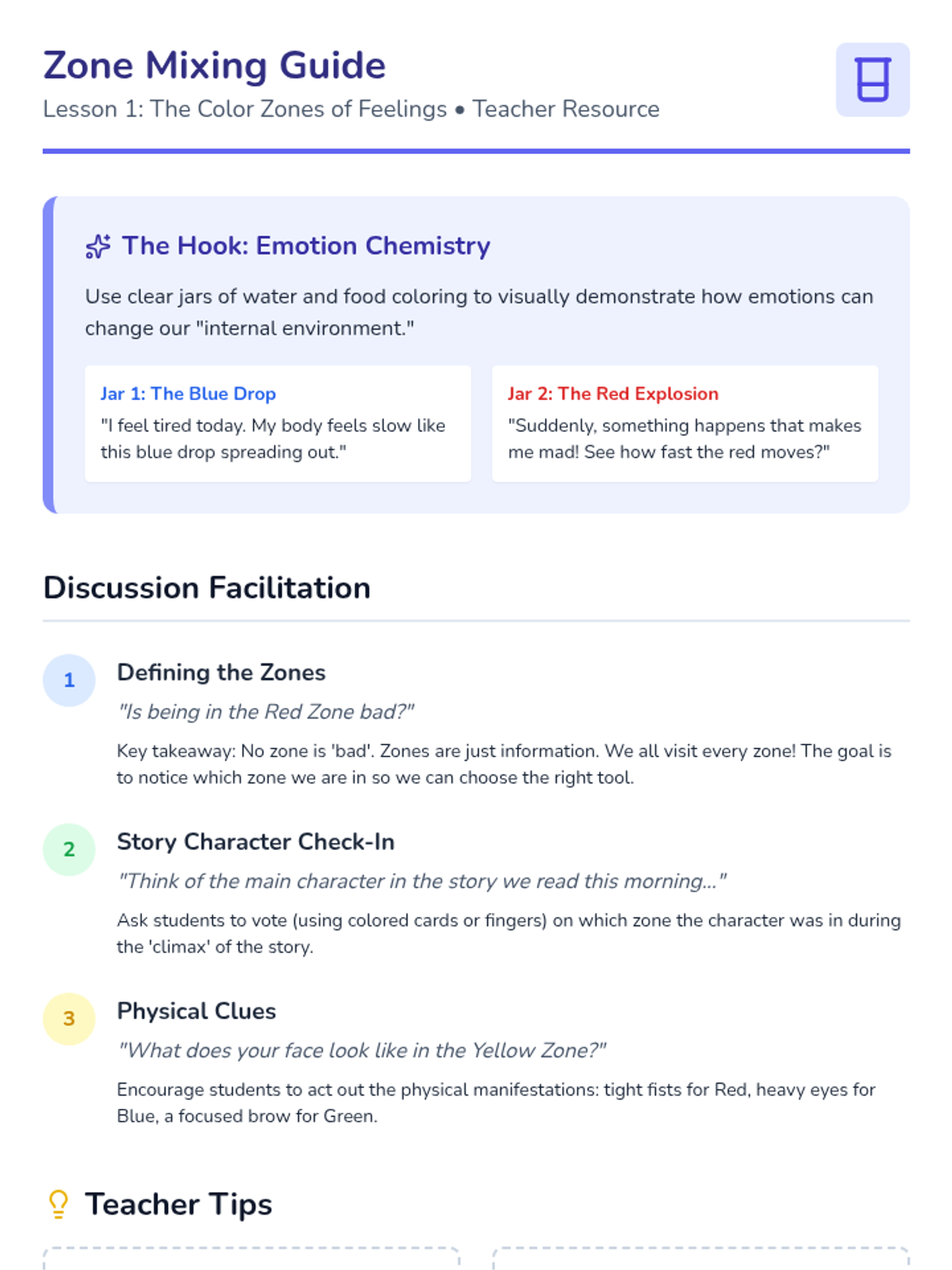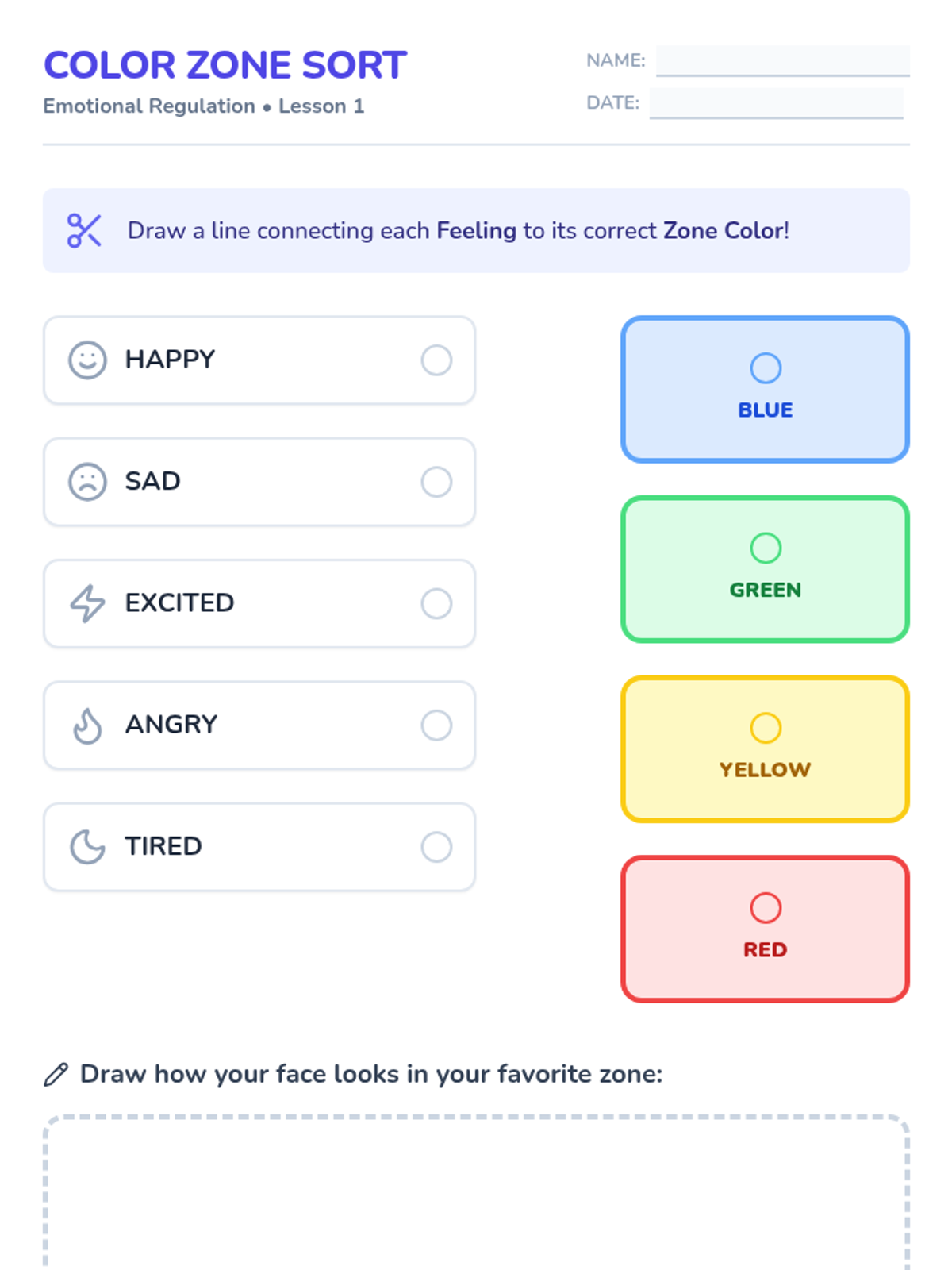 A 1st Grade sequence connecting behavioral tracking to emotional literacy. Students explore color-coded regulation zones, create personal tracking tools, and learn to select coping strategies based on their internal 'data'.