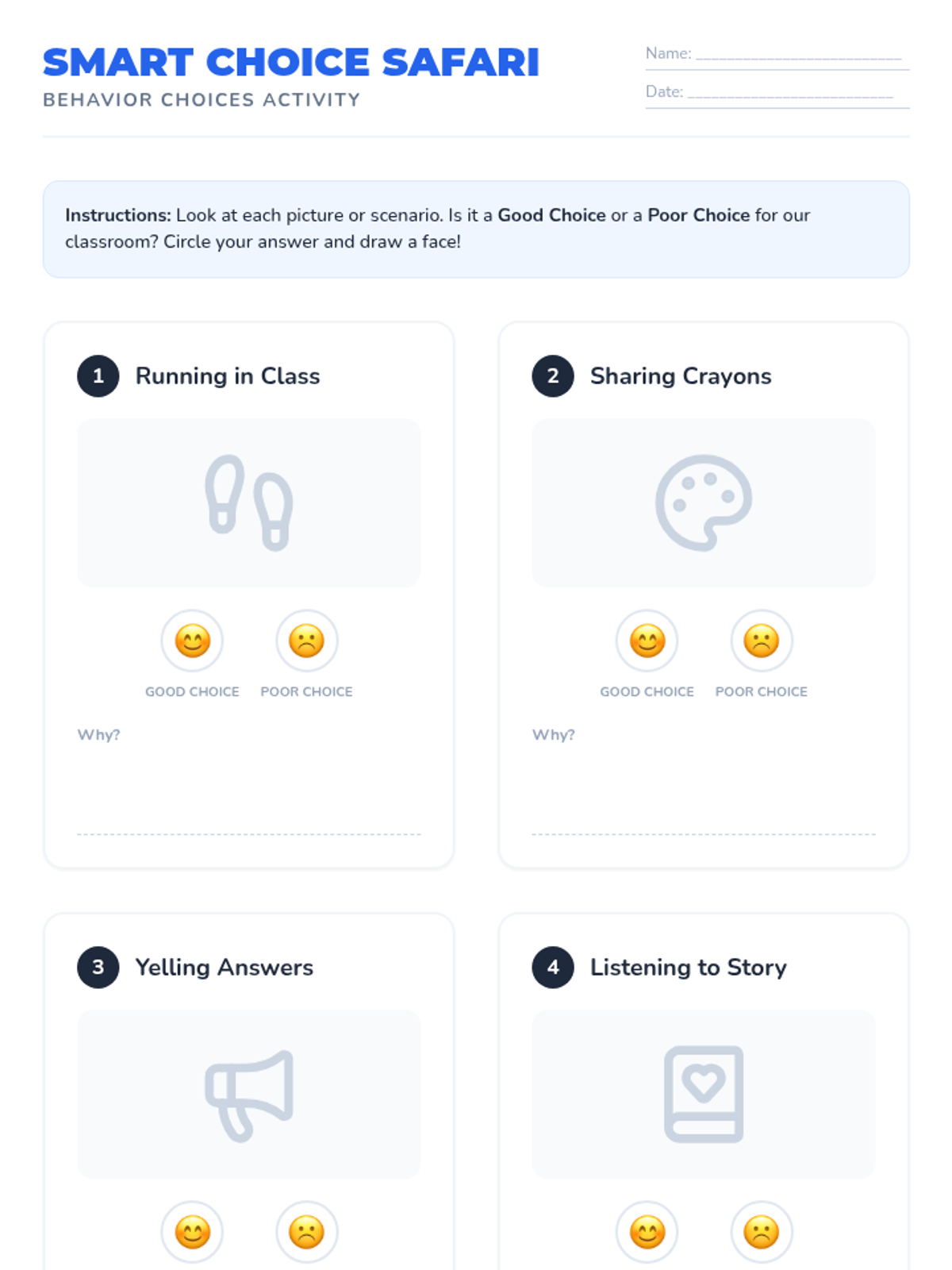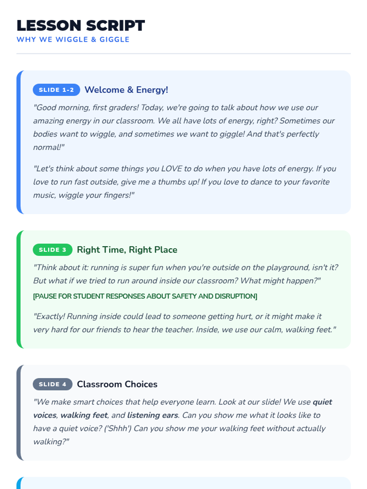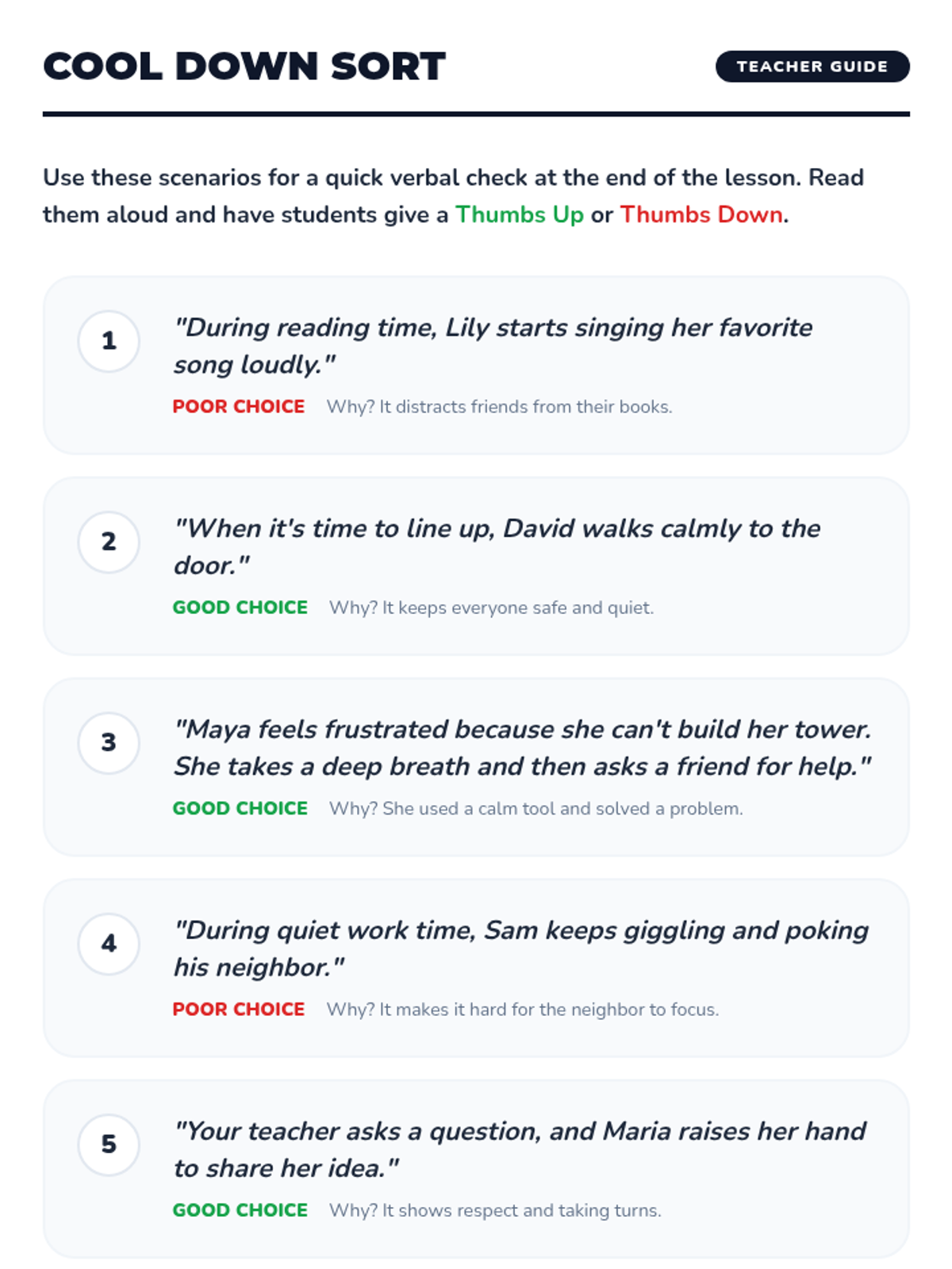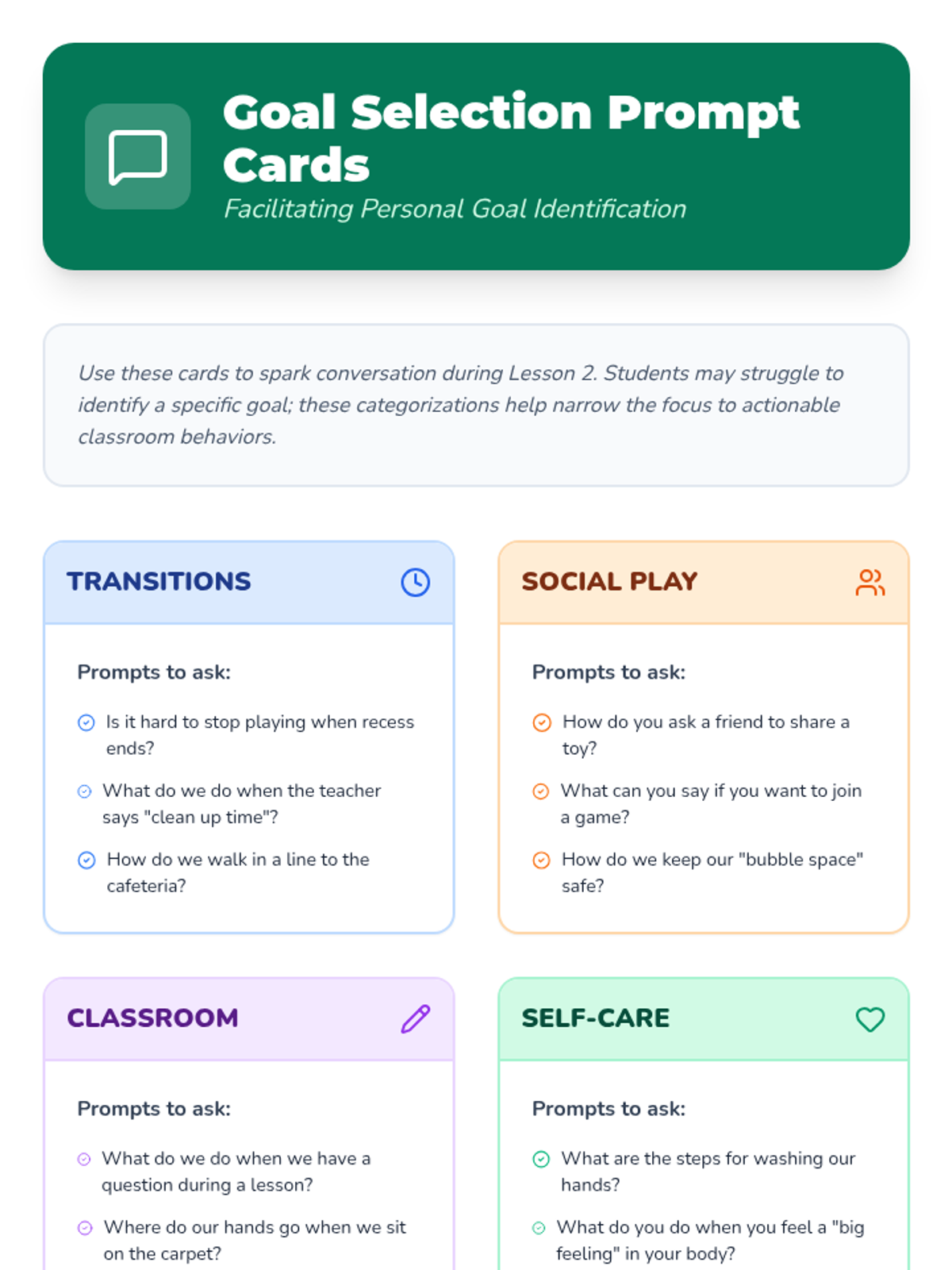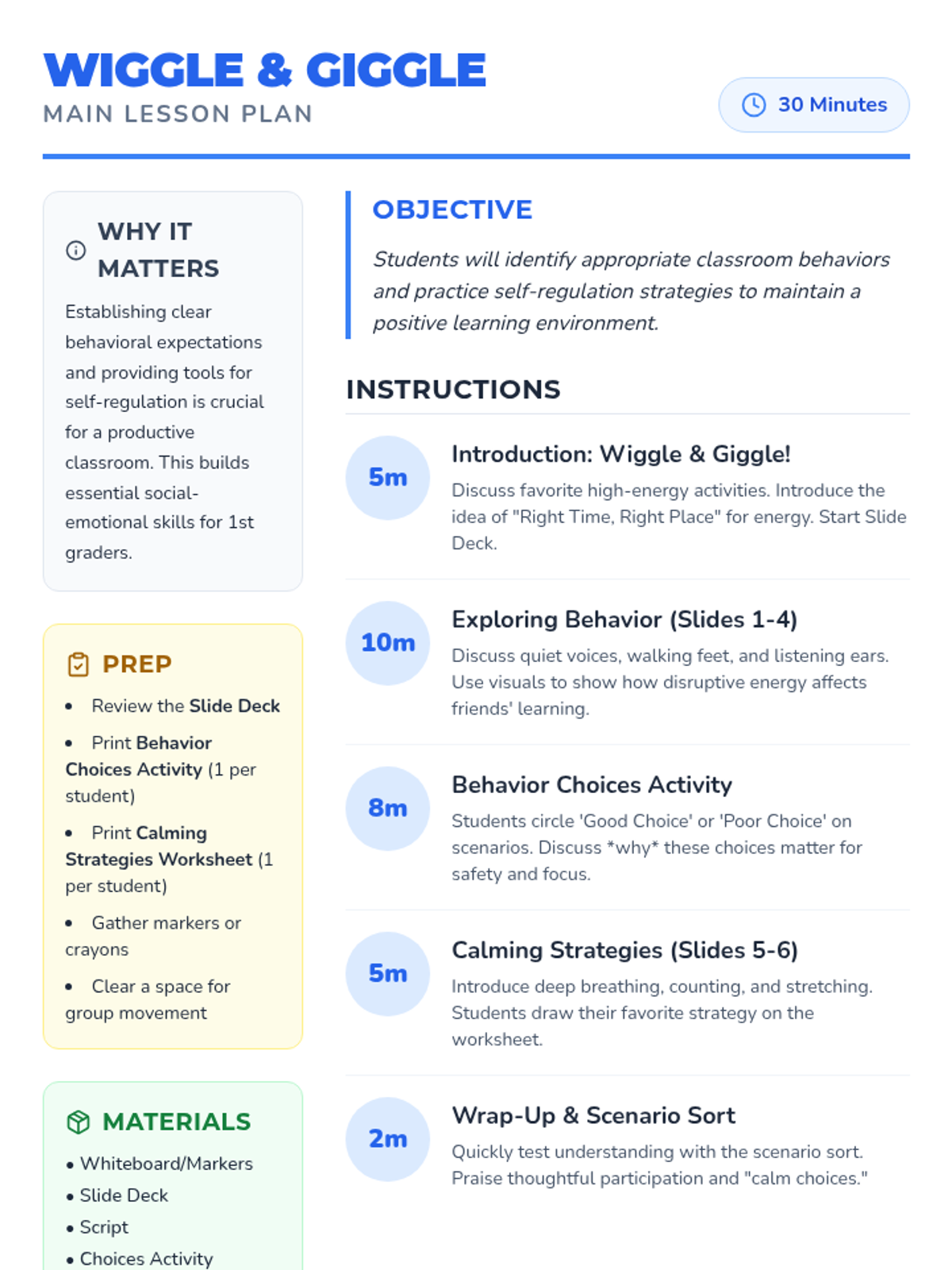 A comprehensive two-part lesson sequence designed for first-grade students to master self-regulation and classroom behavior. It includes a whole-class foundational lesson and a targeted small-group intervention for students needing extra support.