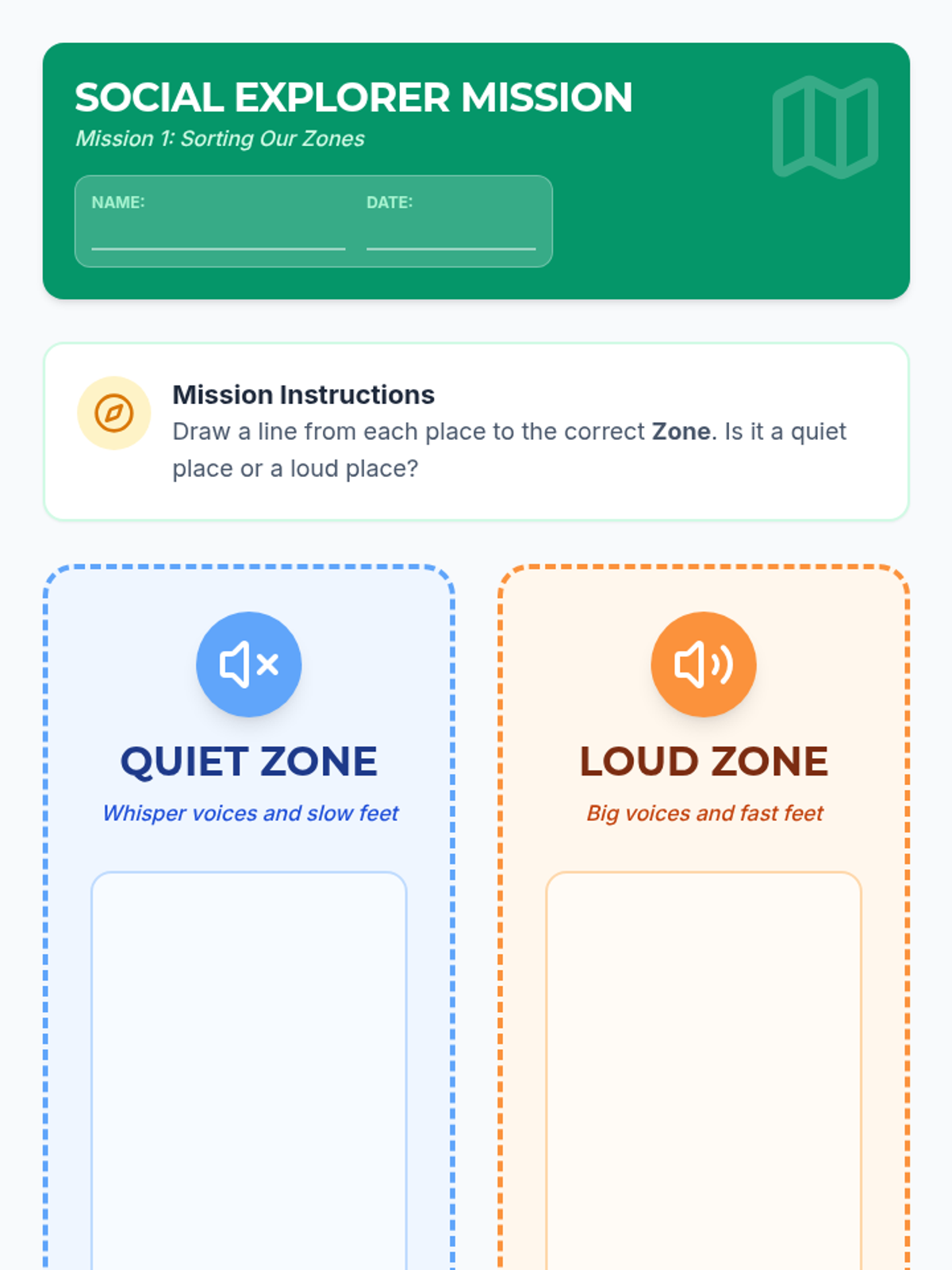 A game-based sequence where 1st Grade students learn to adjust their voice volume and body speed to match different social environments through active sorting and movement activities.