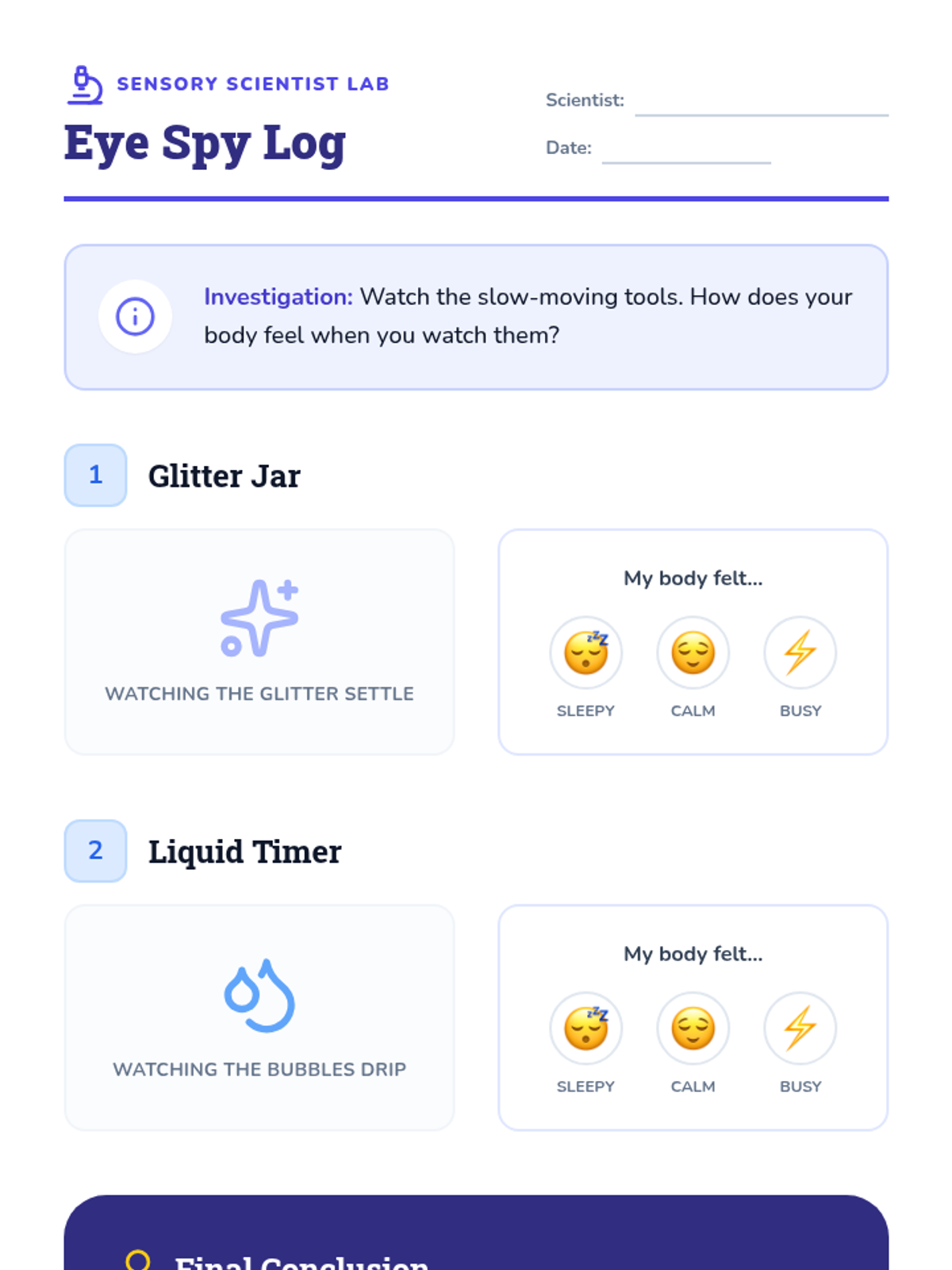 A 1st-grade sequence focused on empowering students to discover and use sensory tools for emotional stabilization. Students act as 'Sensory Scientists' exploring visual, proprioceptive, and tactile inputs to build a personalized recovery toolkit.