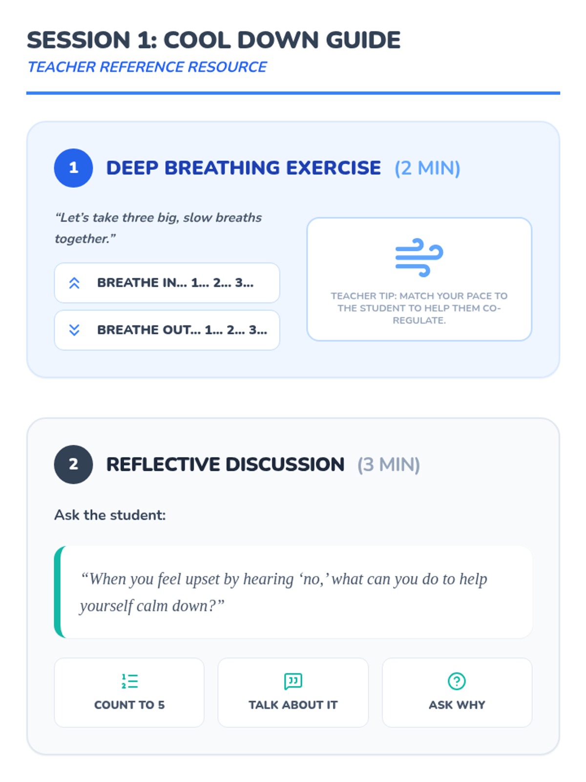 A 5-lesson sequence for 1st Grade students focusing on the recovery phase after dysregulation. It teaches students how to 'reset' their day, check for emotional readiness, repair relationships, use positive self-talk, and build a supportive classroom culture for re-entry.