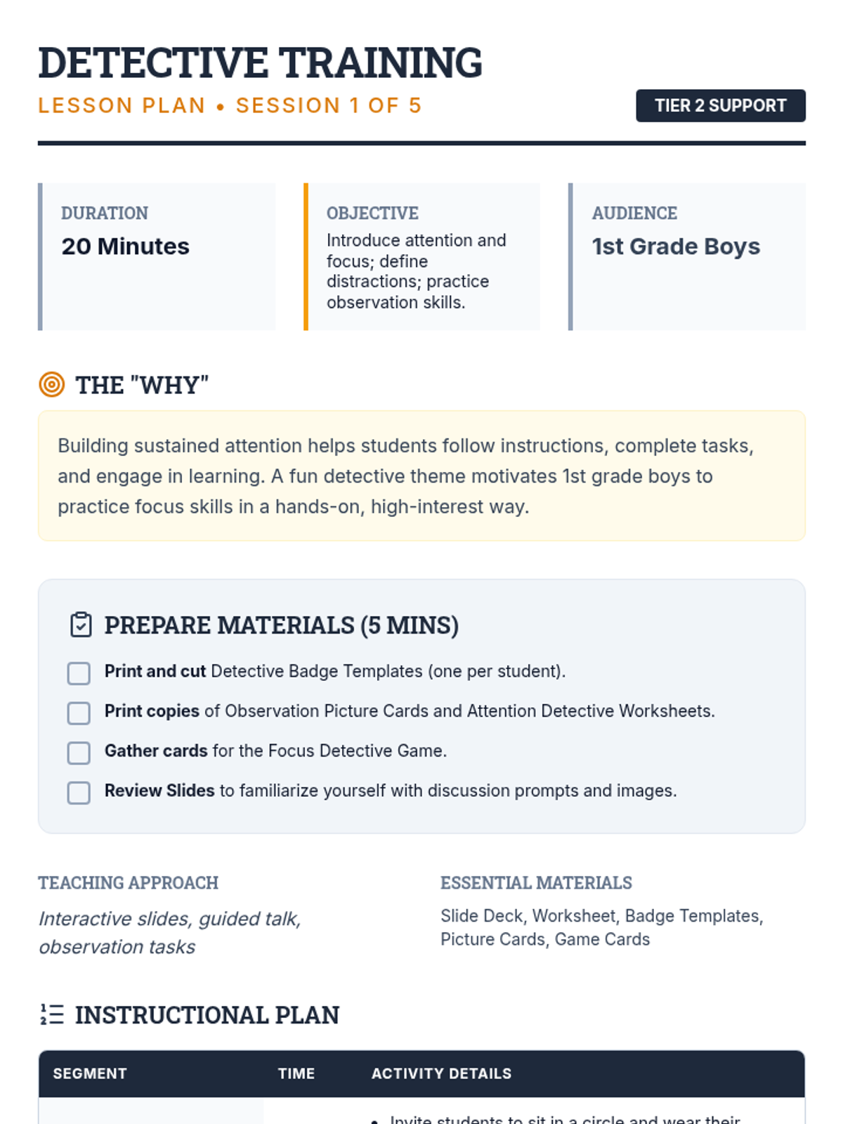 A 5-session social-emotional learning series for 1st grade boys focused on building sustained attention, managing distractions, and practicing observation skills through a fun detective theme. Each 20-minute session includes interactive slides, hands-on activities, and movement games tailored for Tier 2 support.