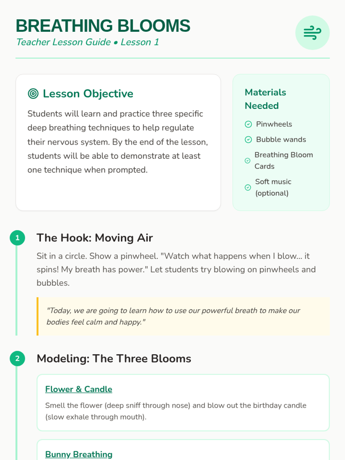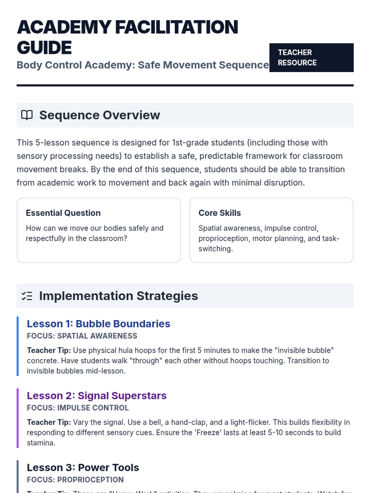 This sequence empowers 1st-grade students to identify 'hot spots' in their daily schedule where proactive sensory breaks are needed. Students learn to use visual timers, establish shared norms for a Break Station, and eventually take leadership roles in guiding their peers through sensory pauses.