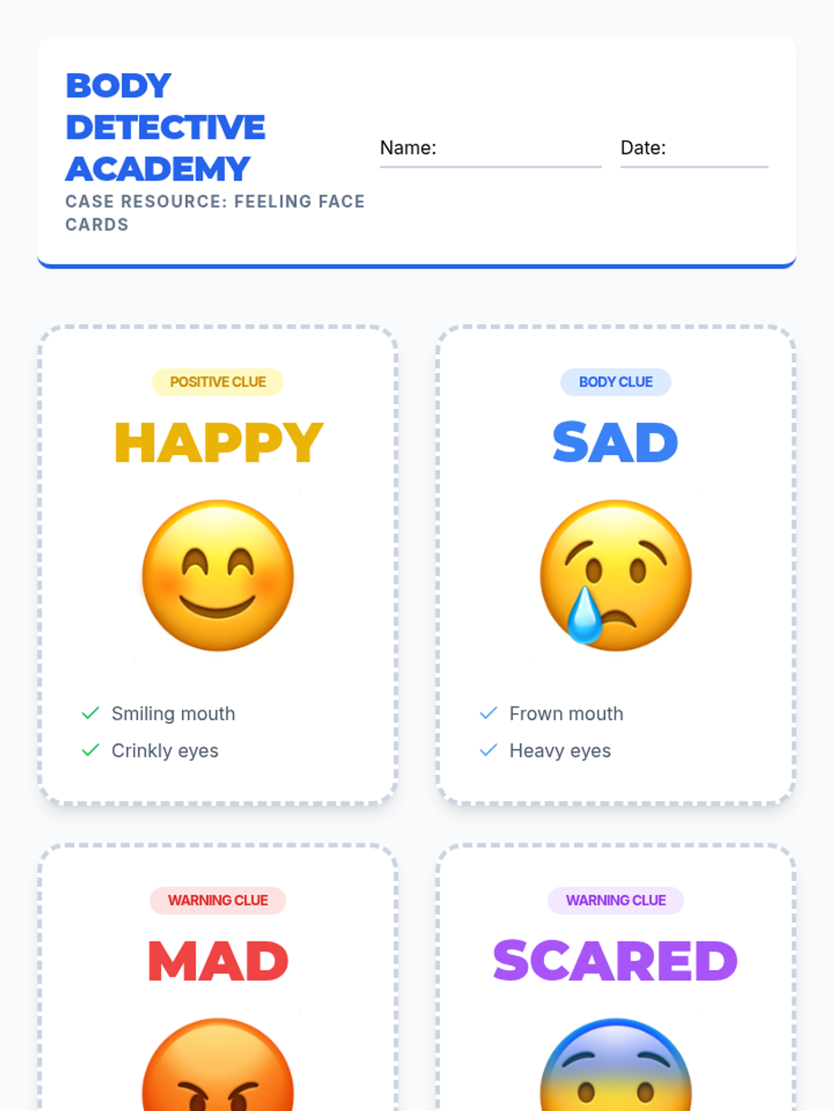 A foundational sequence for 1st-grade students to build interoception and self-awareness by recognizing physical cues and emotional triggers. Students learn to identify core emotions, map body sensations, understand personal stressors, and practice impulse control through the 'volcano' and 'pause button' metaphors.