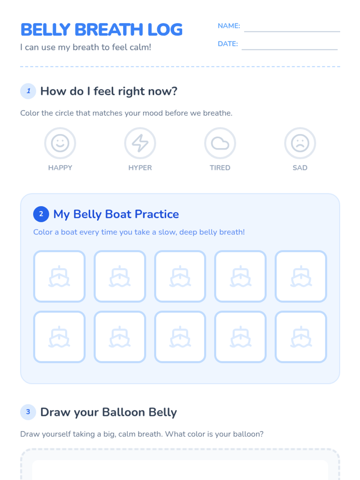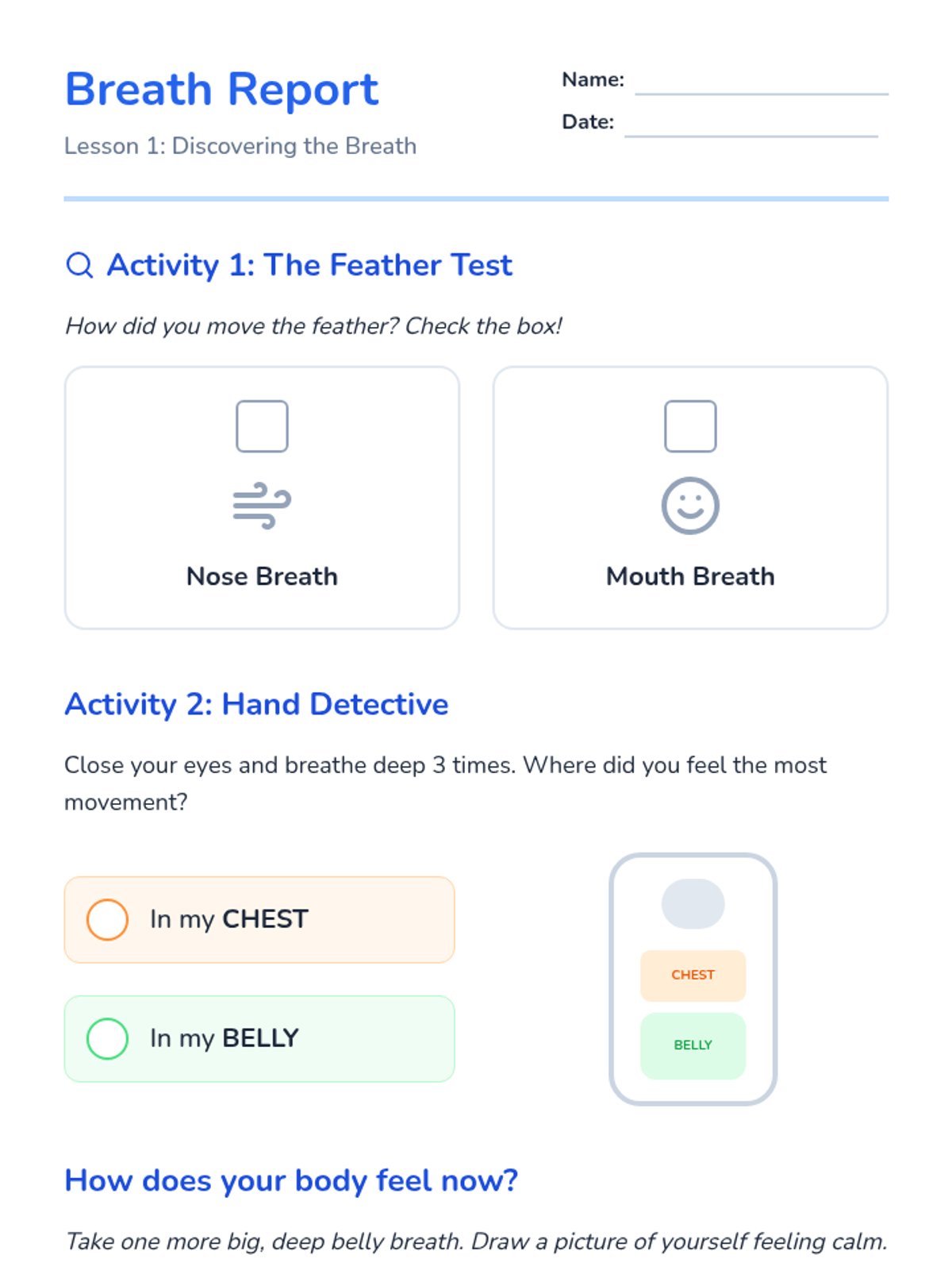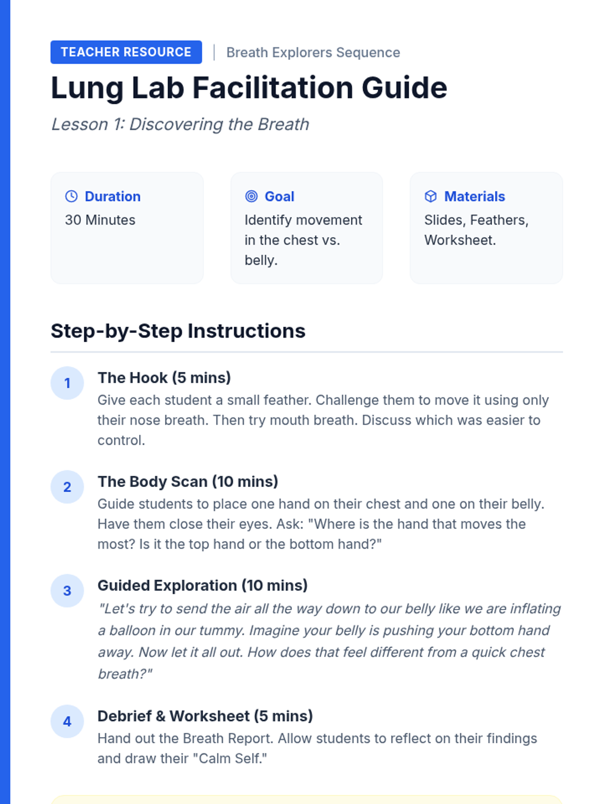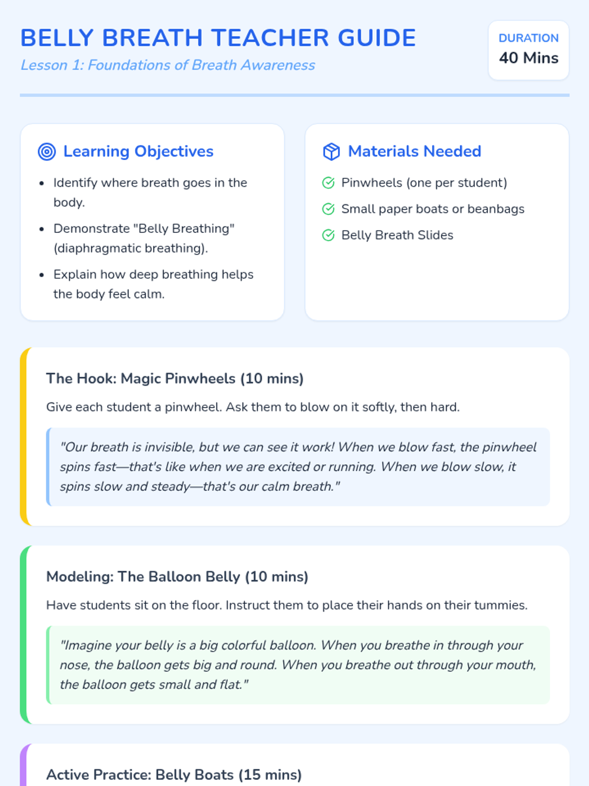 This sequence introduces 1st grade students to the fundamental mechanics of breath as a tool for calming the nervous system. Students explore natural rhythms, practice diaphragmatic breathing with 'belly buddies,' learn tactile hand-tracing techniques, and experiment with animal-themed breaths for energy regulation.