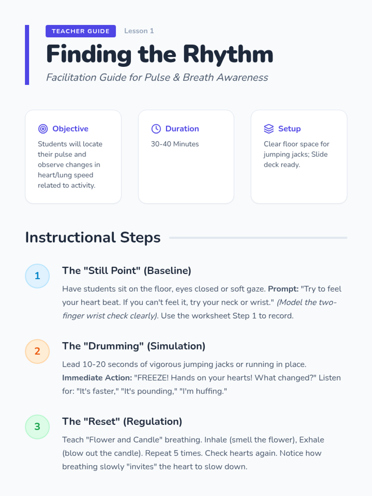 An inquiry-based sequence where students investigate the internal biology of dysregulation and recovery, focusing on heart rate, muscle tension, and breath to identify their physiological baseline.