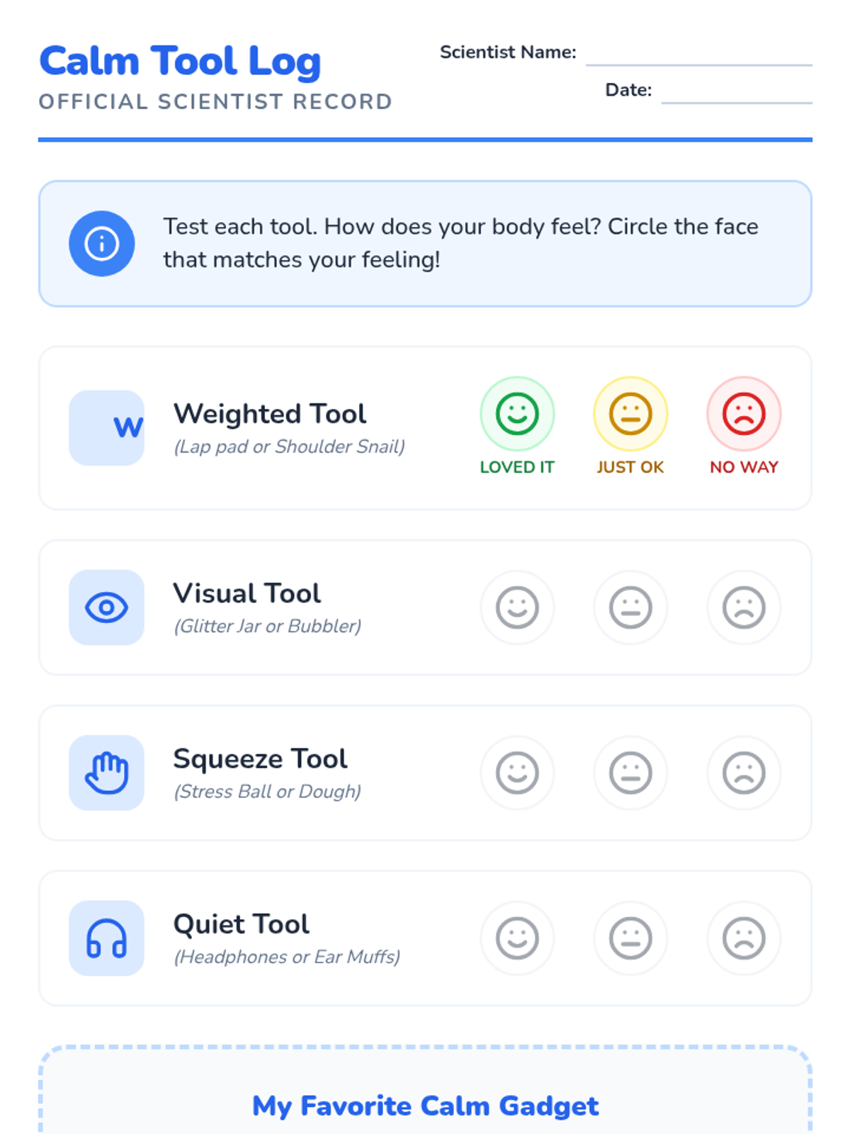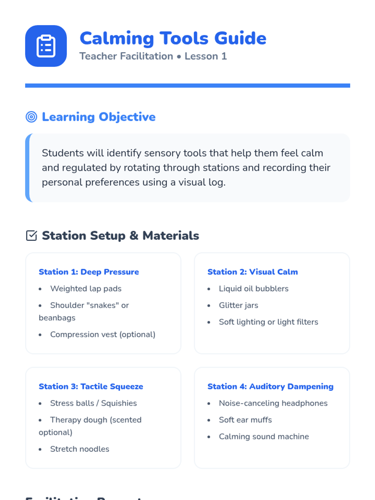 This inquiry-based sequence for 1st-grade students explores sensory tools as functional aids for dysregulation recovery. Students test proprioceptive, tactile, visual, and auditory inputs to build a personalized 'sensory menu' for returning to a calm state.