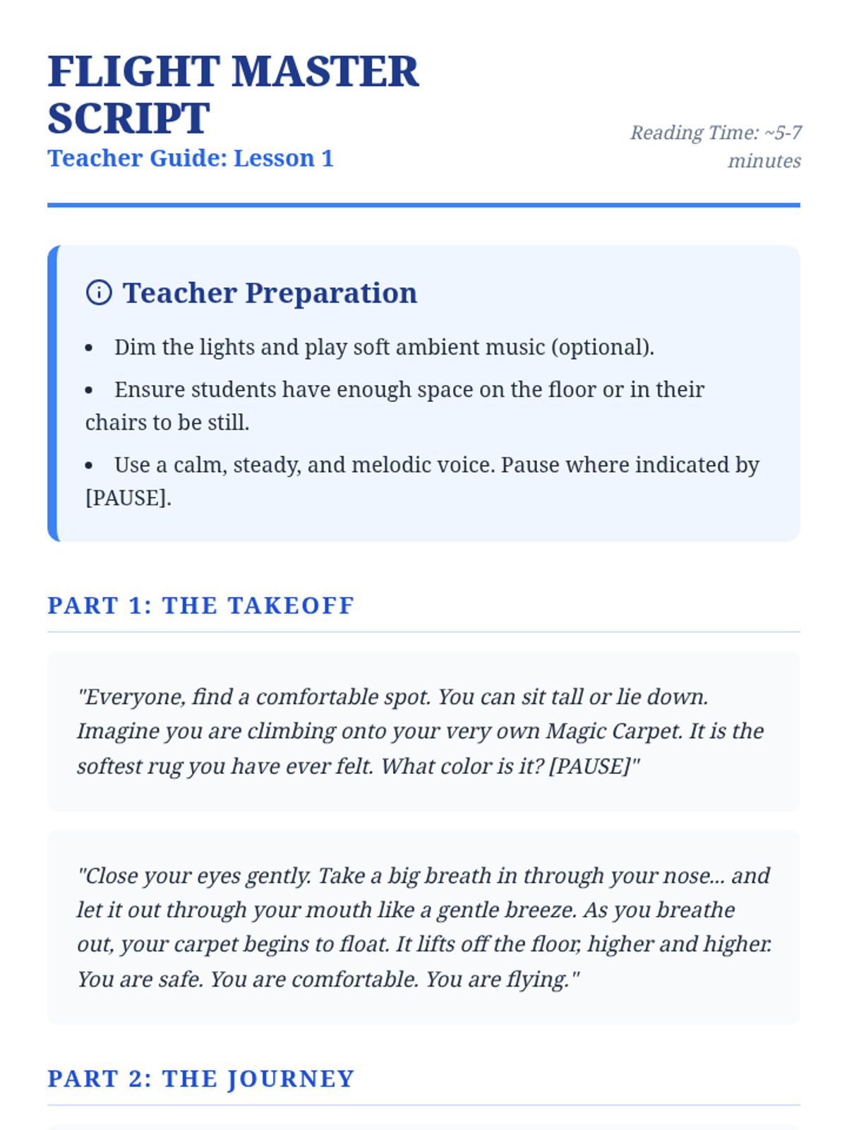 A 5-lesson sequence for 1st-grade students to learn fundamental mindfulness practices, including belly breathing, progressive muscle relaxation, sensory grounding, and emotional awareness, culminating in a personal 'menu' of calm-down strategies.
