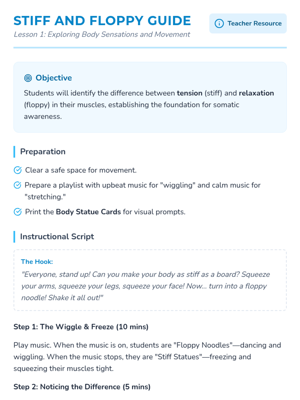 A 5-lesson series for 1st graders focusing on somatic grounding techniques, teaching students to recognize body signals, master belly breathing, release muscle tension, and build physical stability to manage distress.
