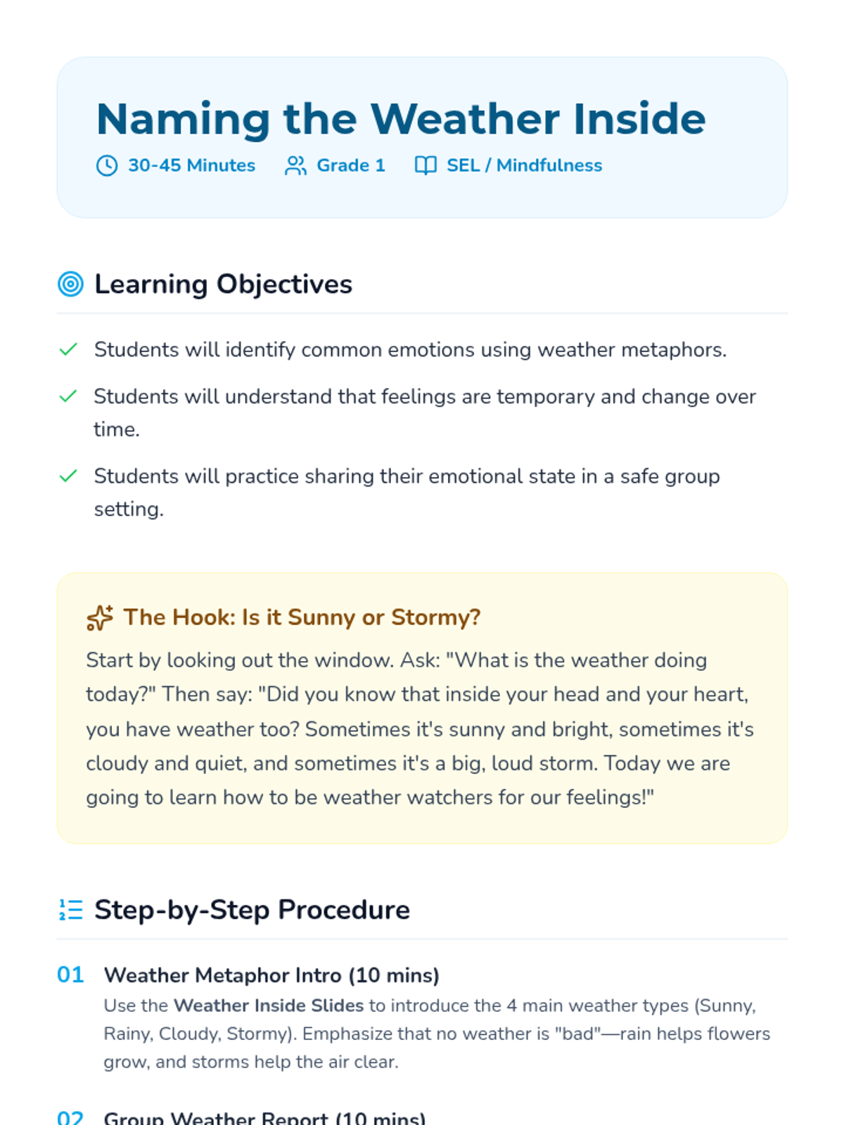 A comprehensive sequence focused on helping students identify physical and emotional signs of stress and anxiety, while building a toolkit of processing strategies. Using a 'weather' metaphor, students learn to monitor their 'inner weather' and apply 'forecast' strategies to return to calm.