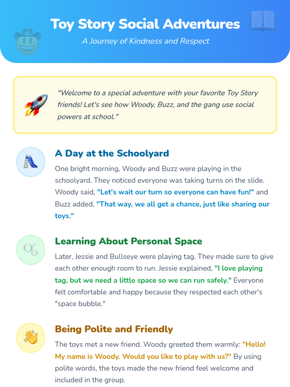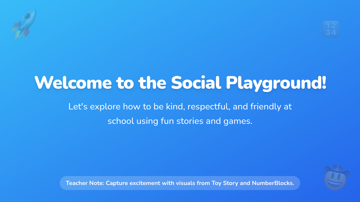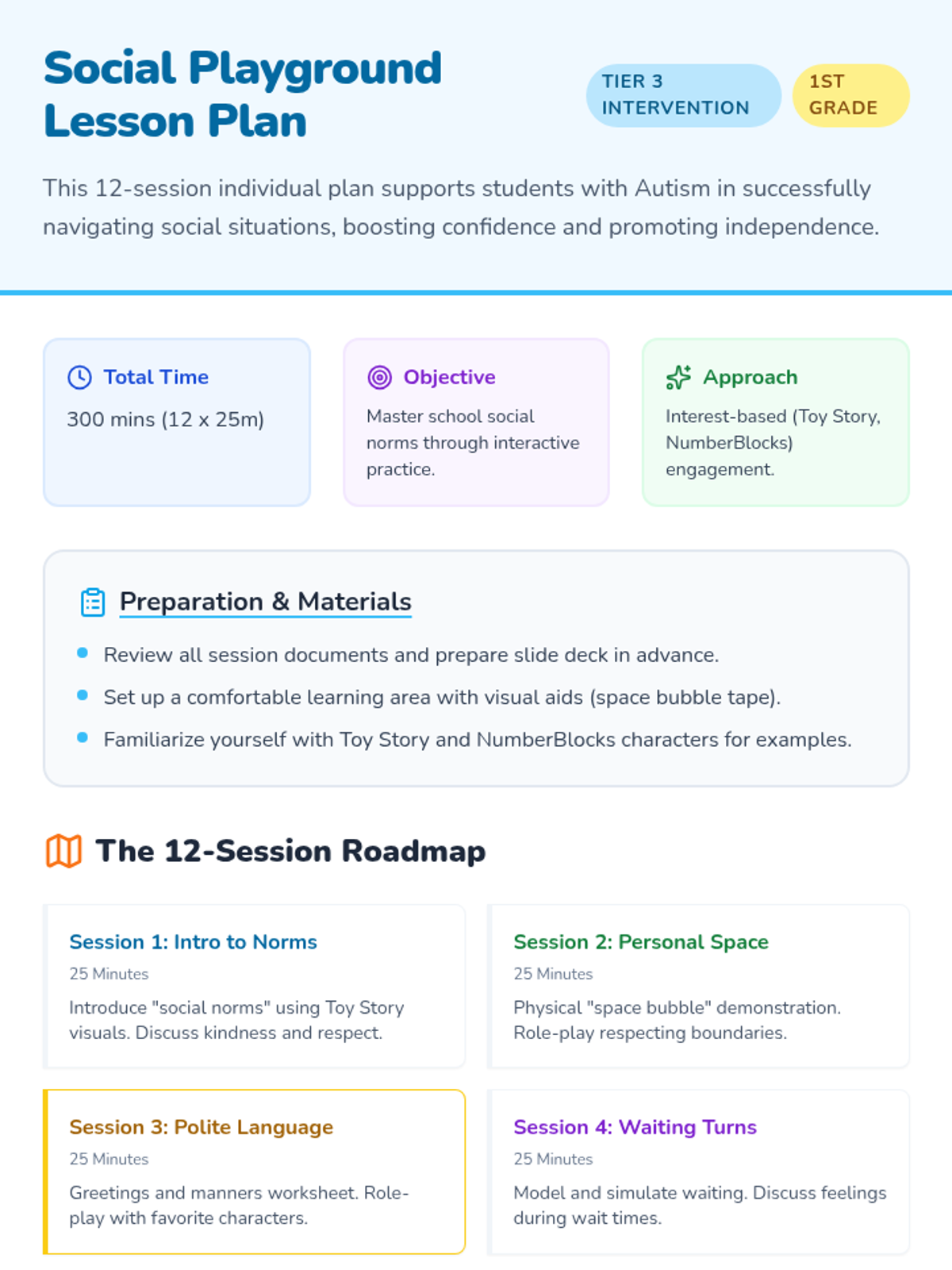 A 12-session individual social skills sequence for 1st-grade students, focusing on school social norms like personal space, polite language, and turn-taking through the lens of Toy Story and NumberBlocks.