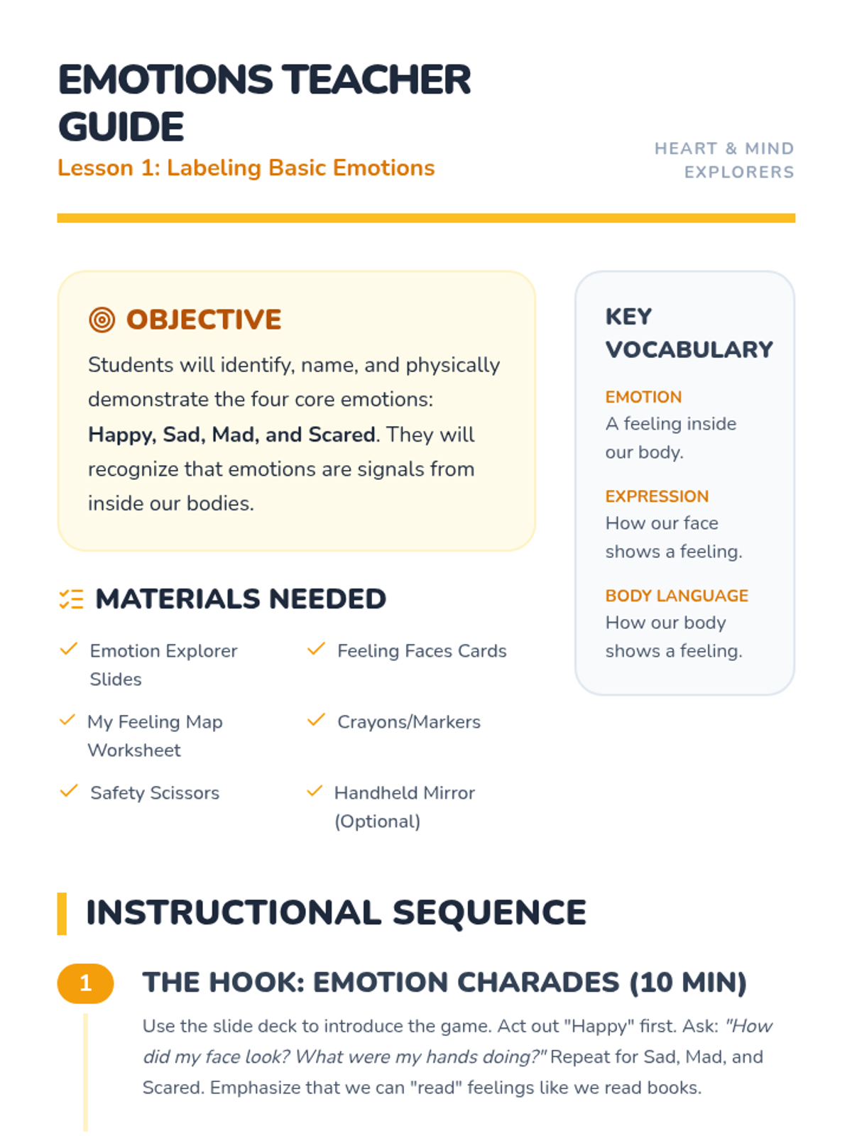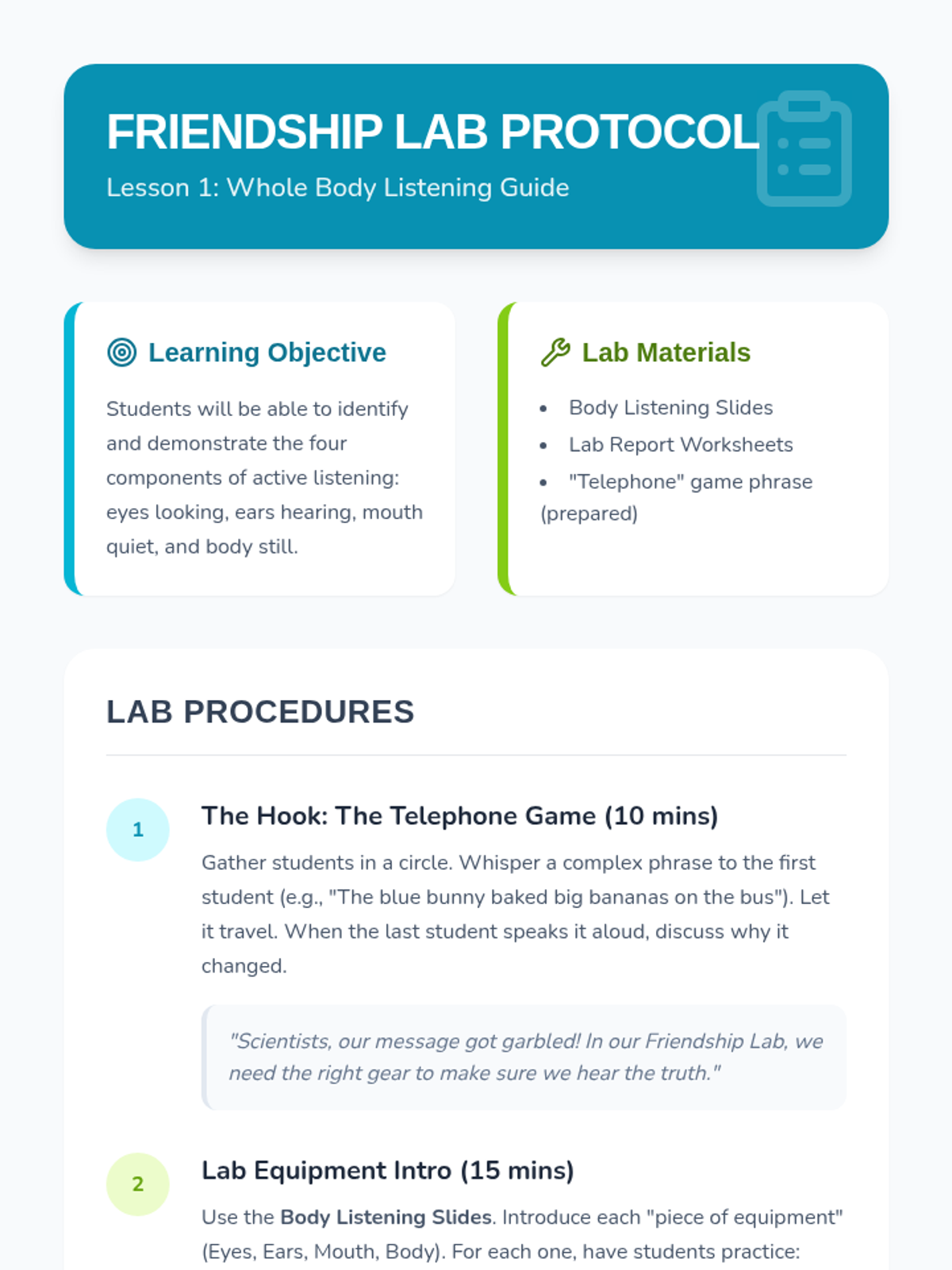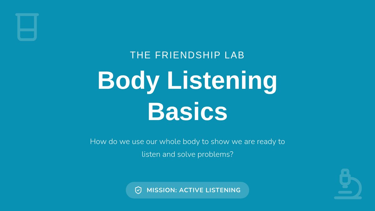 This sequence teaches 1st Grade students the foundational skills of active listening and empathy as tools for conflict resolution. Through the 'Friendship Lab' theme, students learn how to use their bodies to listen, wait for their turn to speak, reflect others' thoughts, and identify feelings to better understand their peers.