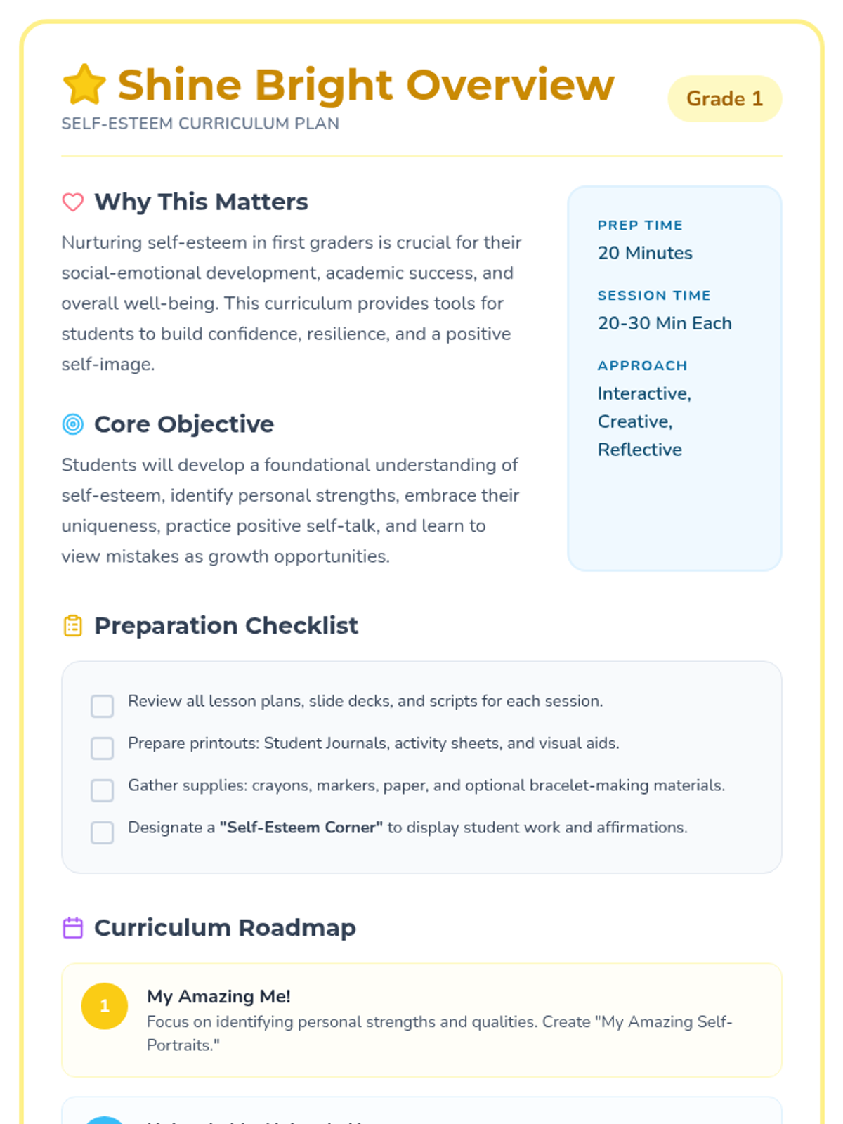 A comprehensive 5-session curriculum for 1st-grade students to explore self-esteem, identify strengths, embrace uniqueness, and build resilience. Students create a personal journal throughout the journey to document their growth and positive self-image.
