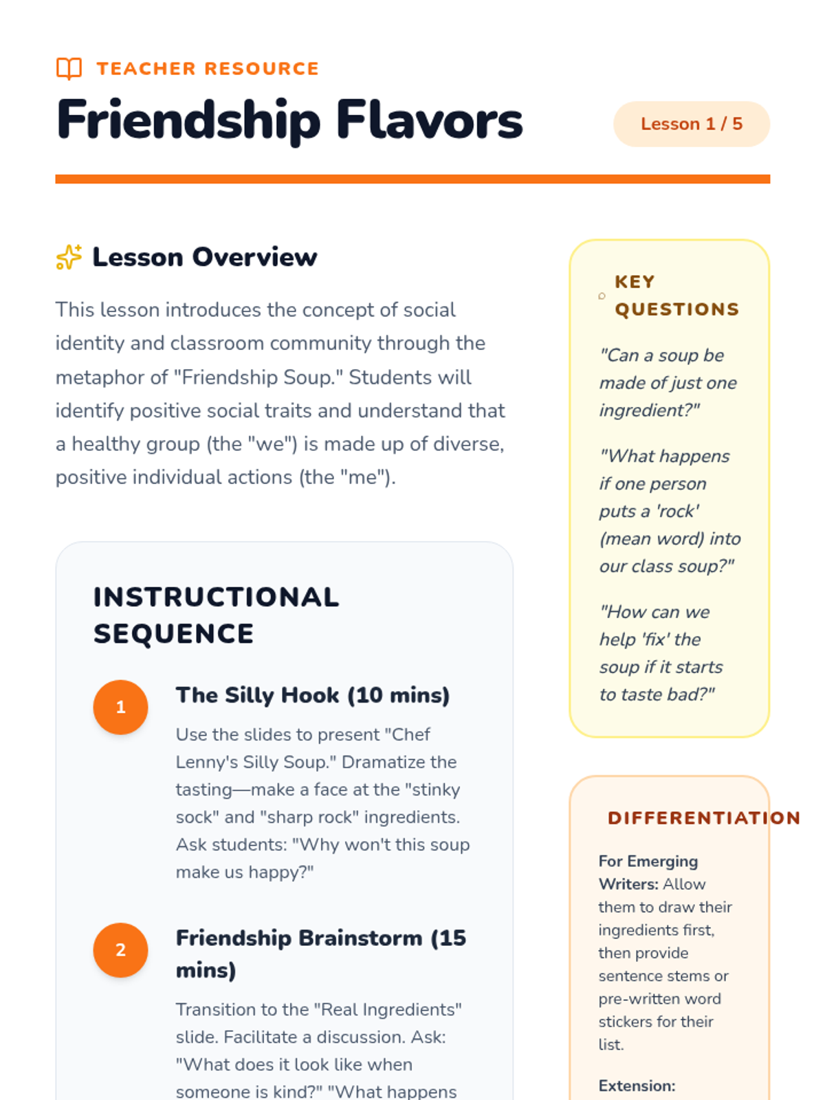 This sequence guides first-grade students through forming a supportive classroom community by exploring individual identities, finding connections, practicing active listening, and learning active inclusion strategies.