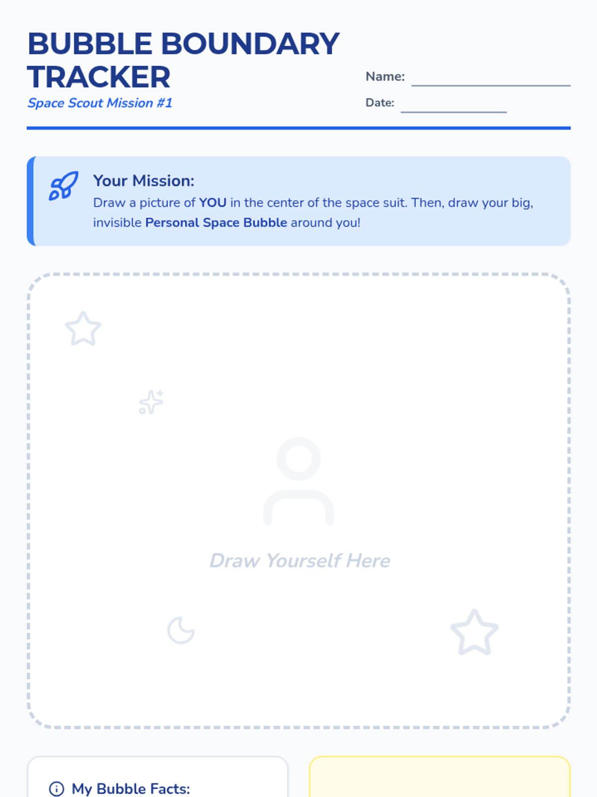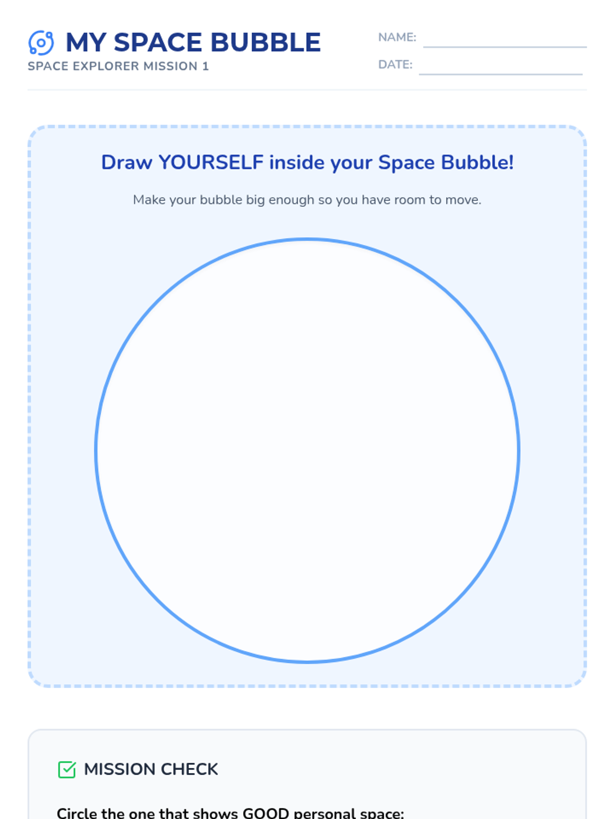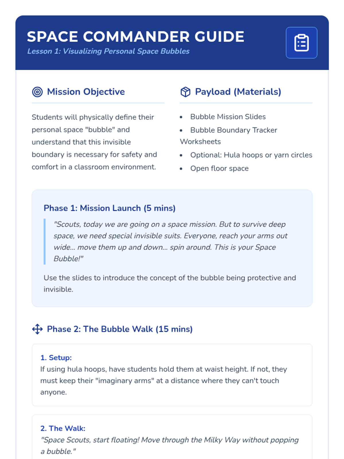 A 5-lesson unit for 1st graders focused on personal space, boundaries, and consent using a fun 'Space Scouts' theme. Students progress from physical awareness to verbal communication and empathy-building.