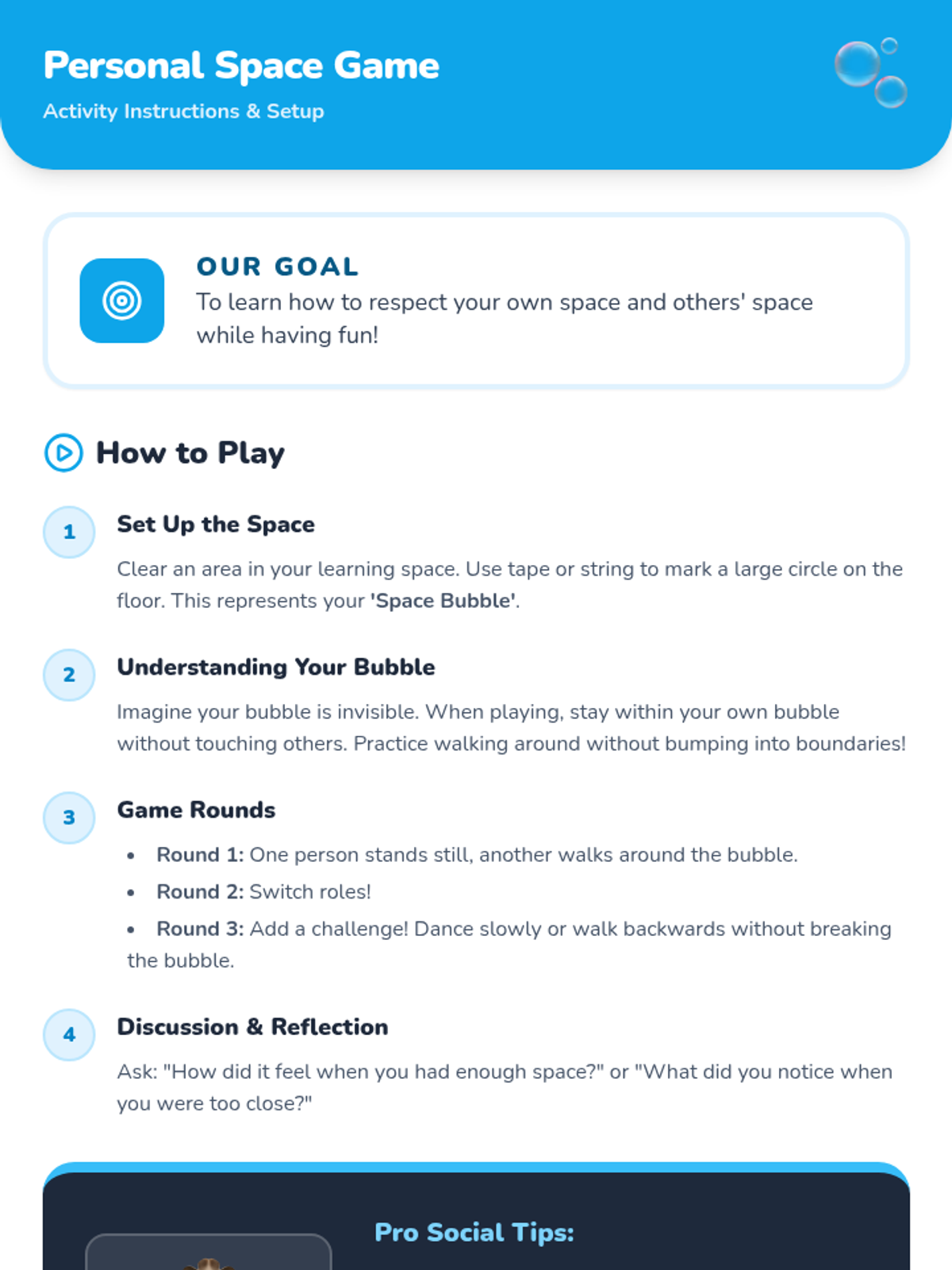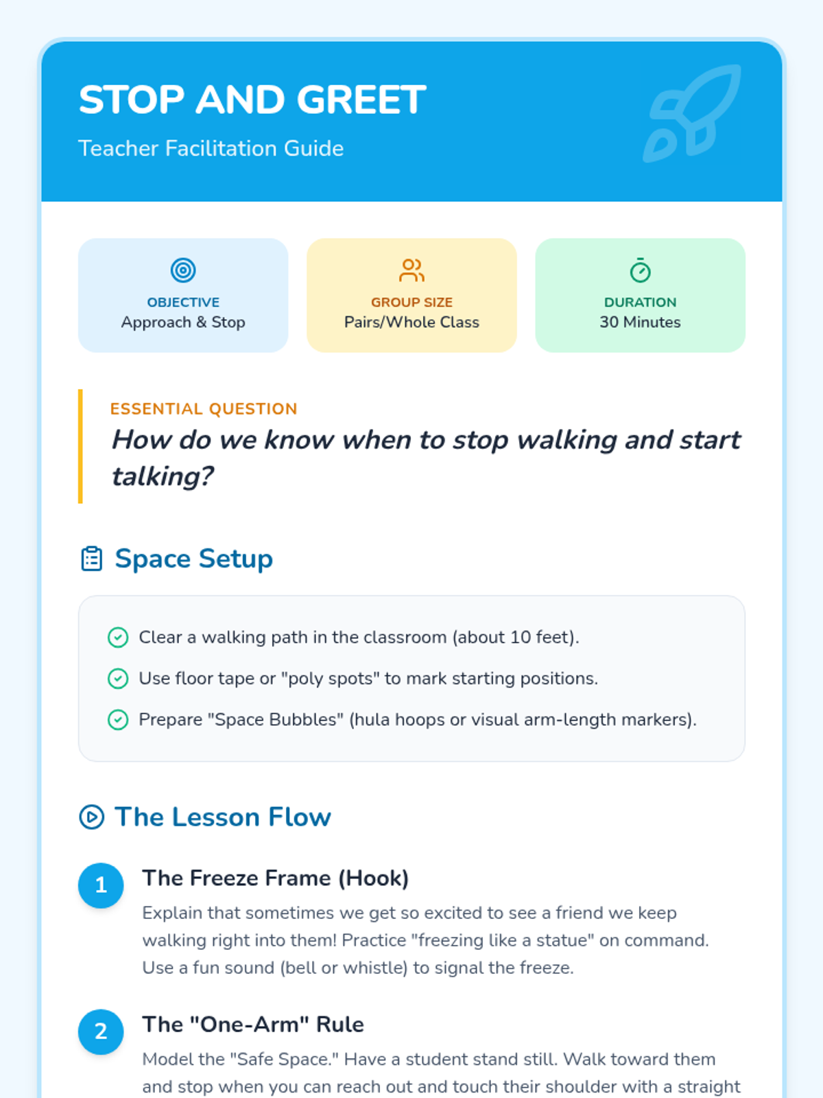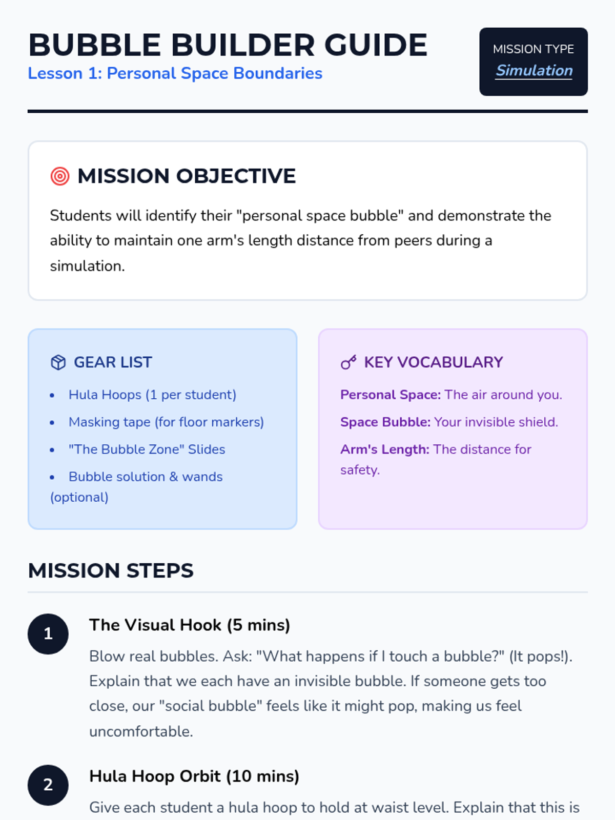 A 5-lesson unit for 1st graders focused on personal space, boundaries, and consent using a fun 'Space Scouts' theme. Students progress from physical awareness to verbal communication and empathy-building.
