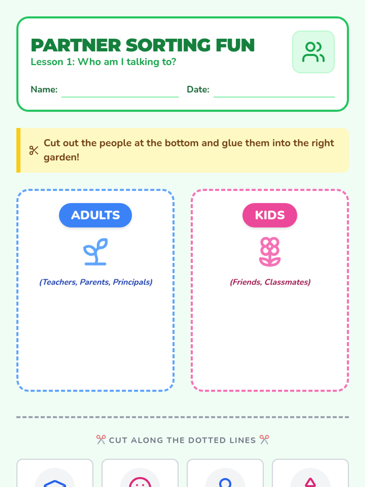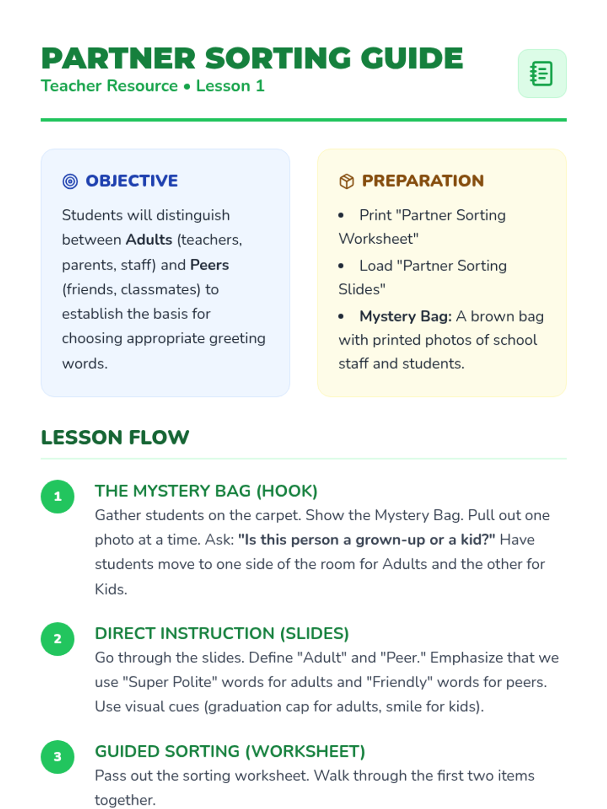This sequence teaches 1st Grade students in Special Education settings how to identify social partners and choose appropriate verbal greetings and volumes. Through visual categorization and role-play, students build foundational social communication skills.
