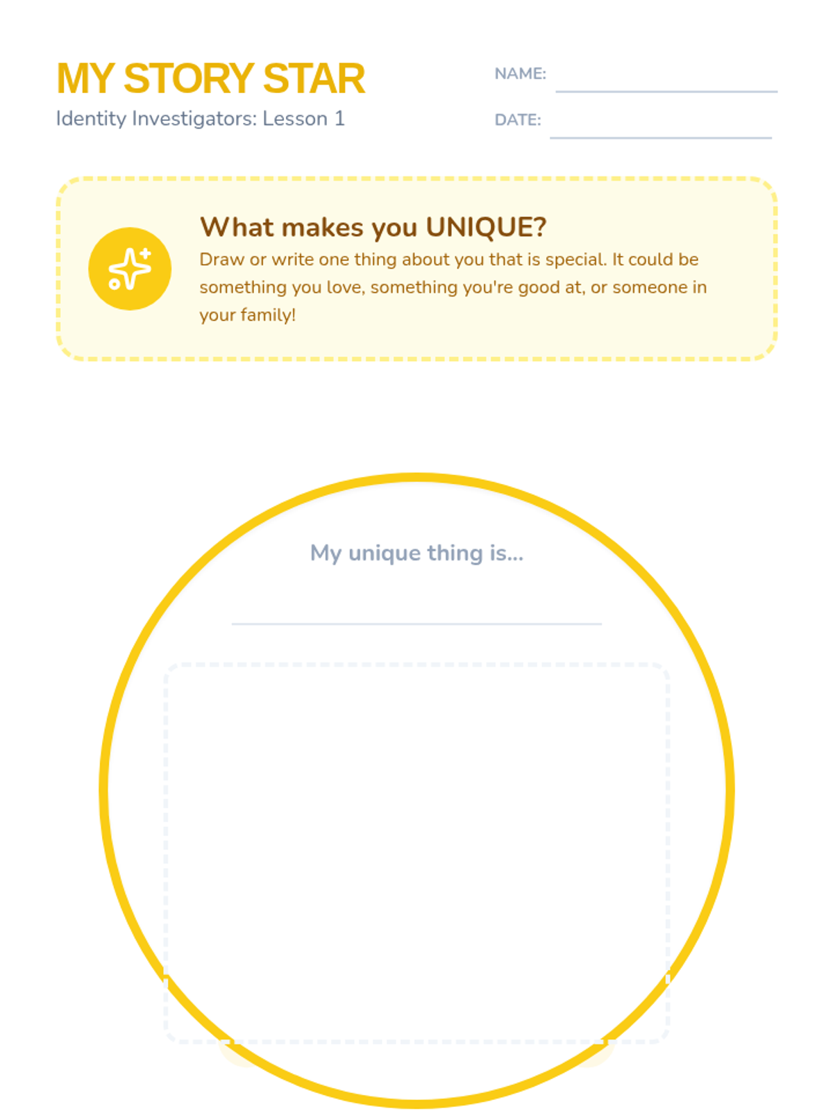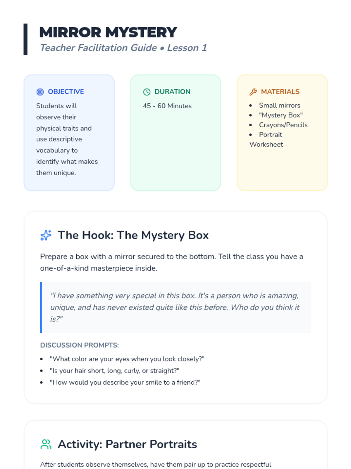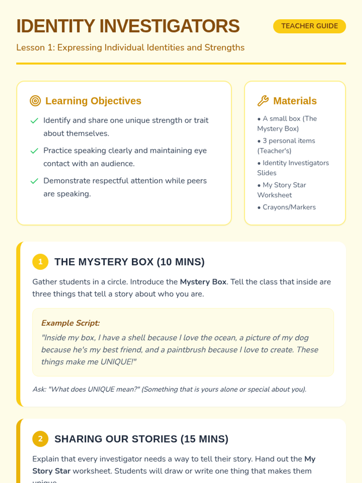 This sequence introduces students to the concept of personal identity by distinguishing between physical attributes and internal character traits. Students explore their own strengths, recognize how actions reflect identity, and learn to view growth areas through a growth mindset, culminating in a symbolic self-portrait.