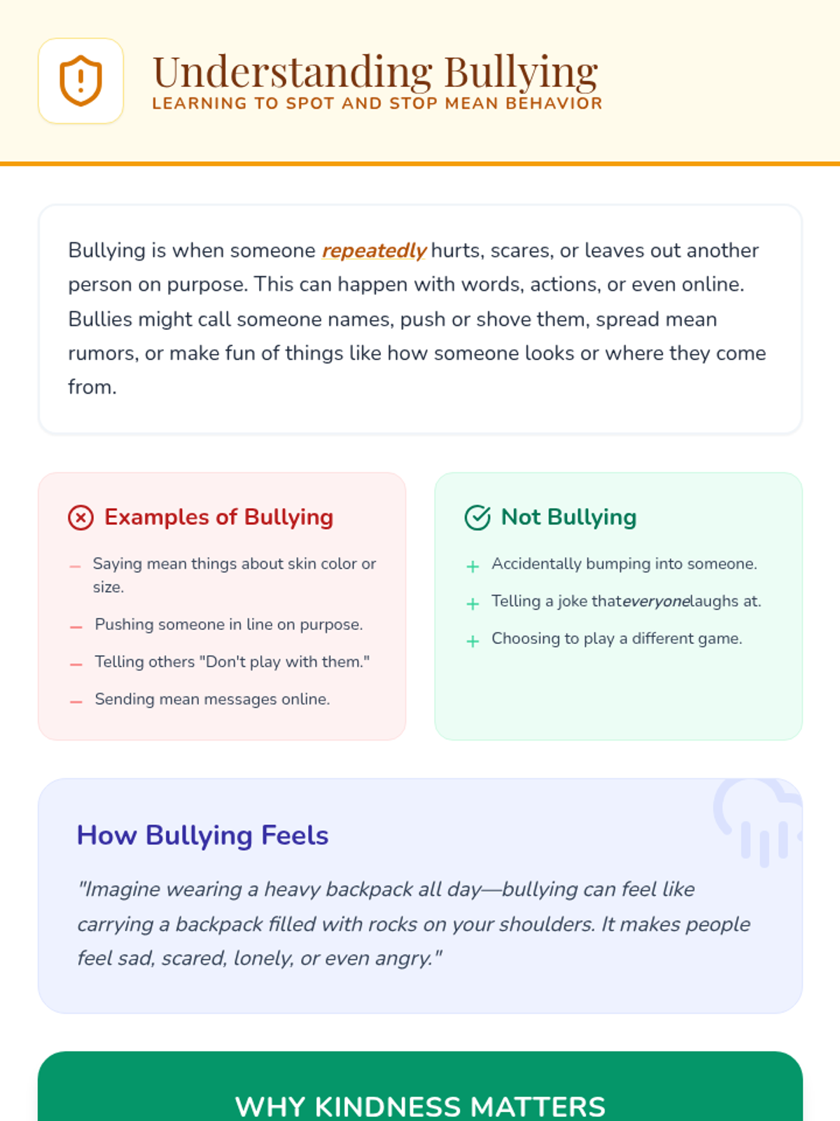 A six-lesson series for K-3 students with communication IEPs, specifically those who stutter. The sequence focuses on defining bullying, identifying feelings, building self-advocacy through brave words and I-statements, and fostering empathy to become upstanders.