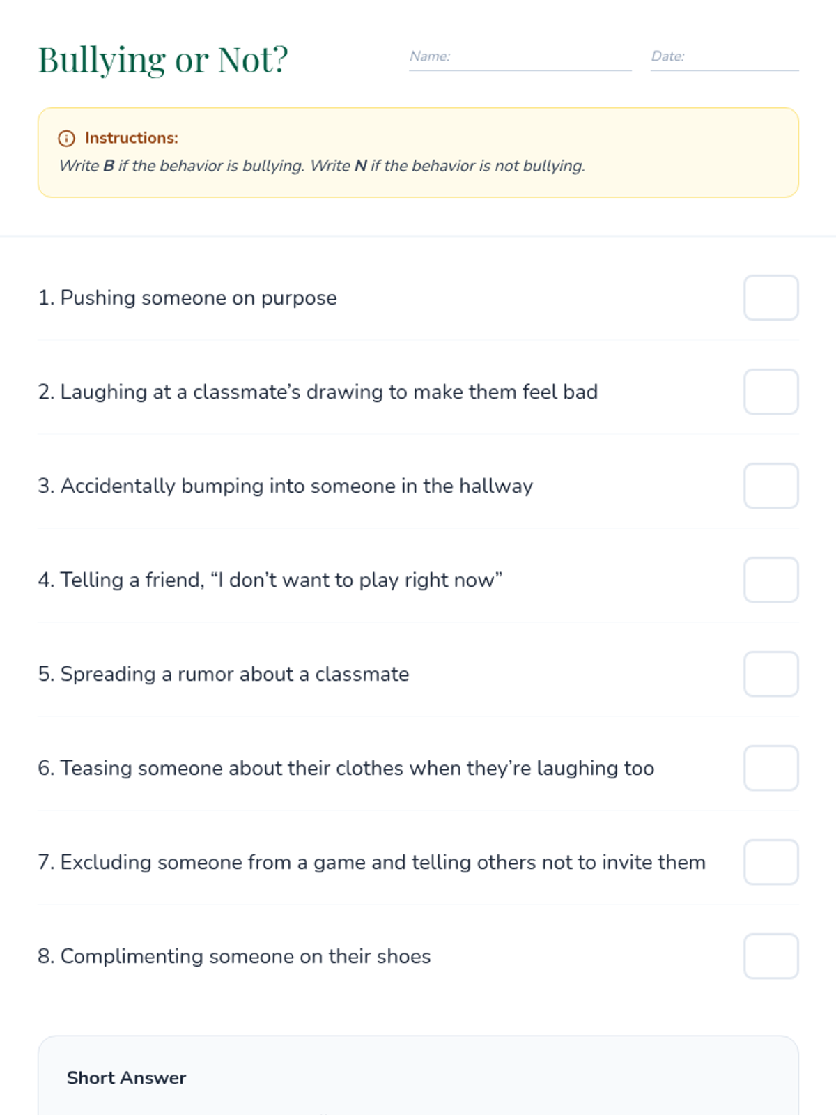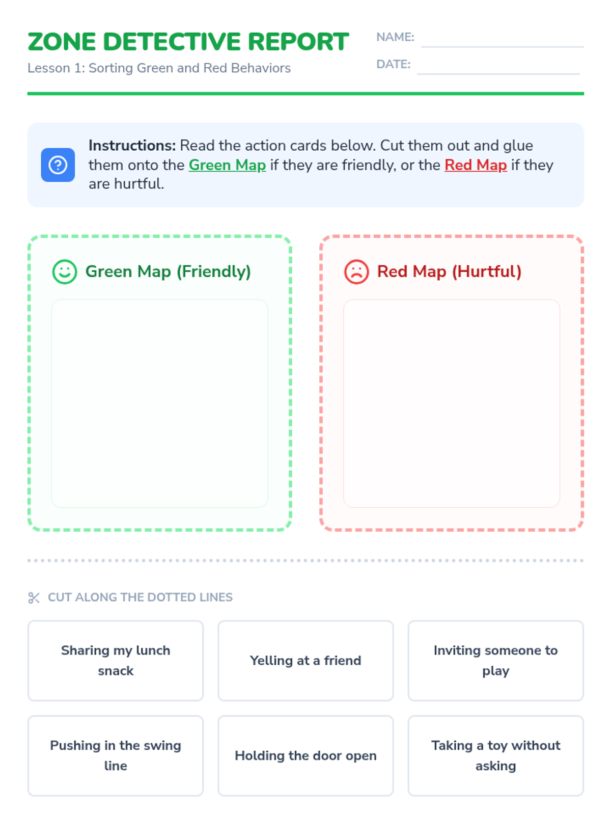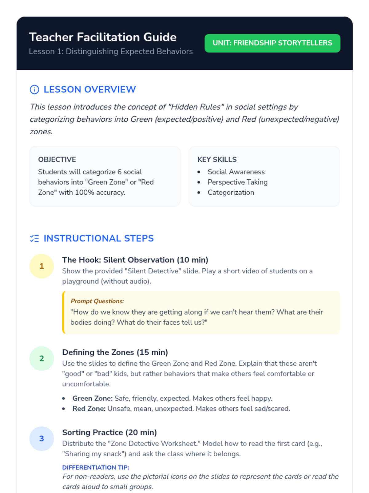 A 5-lesson unit where students become 'Friendship Detectives' to identify healthy and unhealthy relationship dynamics. Using case studies, sorting games, and creative projects, students learn to recognize green and red flags, distinguish between teasing and bullying, and resolve conflicts safely.
