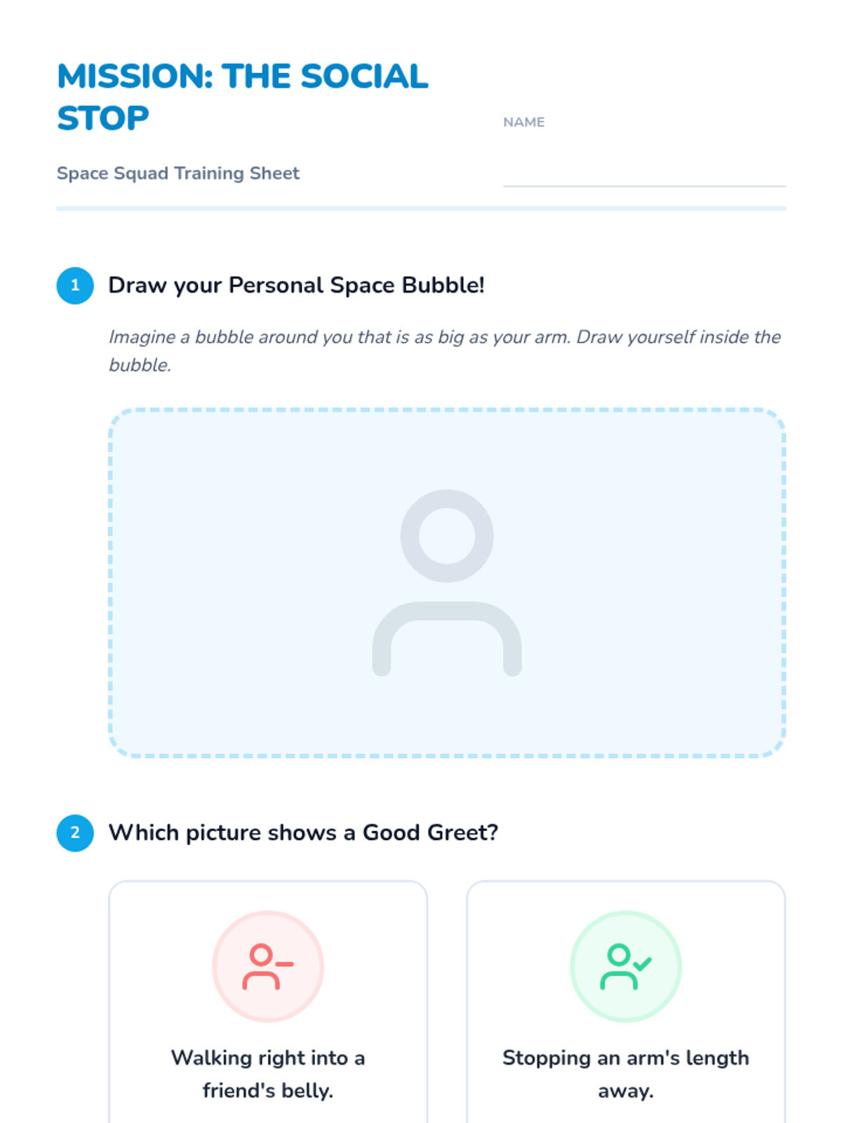 A 1st Grade Social Communication sequence focused on non-verbal components of greetings, specifically physical boundaries, personal space, and appropriate gestures. Students use a 'Space Explorer' theme to learn about personal space bubbles, body orientation, and choosing the right greeting for different people.