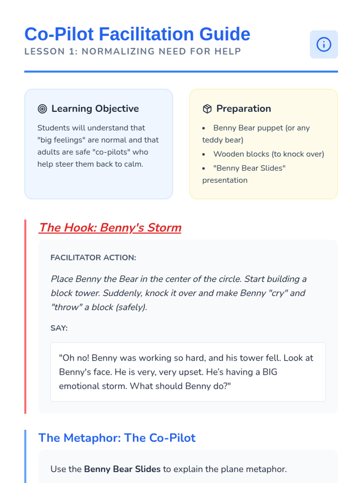 A 5-lesson sequence for Pre-K students focused on co-regulation, accepting adult help during dysregulation, and successfully transitioning back to social play using restorative 'repair' rituals.